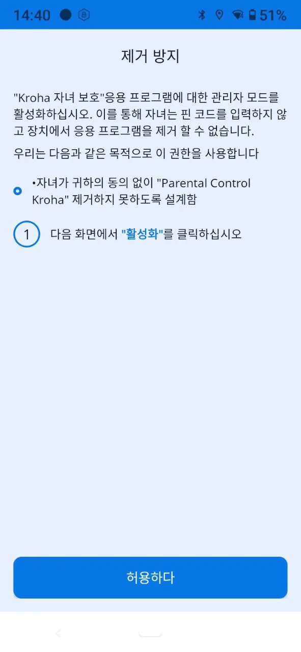 자녀 보호 앱의 설정은 사용자가 최대한 쉽게 할 수 있도록 설계되었습니다. 자녀 보호 앱은 권한 설정의 필요성을 설명하며, 사용자는 앱에서 제공하는 지침을 따르기만 하면 됩니다. 애플리케이션이 제대로 작동하려면 요청된 모든 권한을 부여해야 합니다. 전체 설정은 2-3분 이상 걸리지 않습니다.