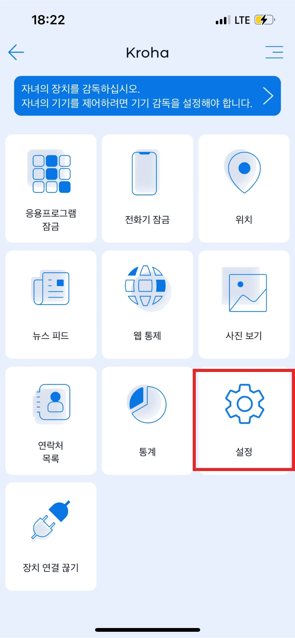 Kroha 앱의 메인 메뉴에 있는 '설정' 버튼 (iOS)