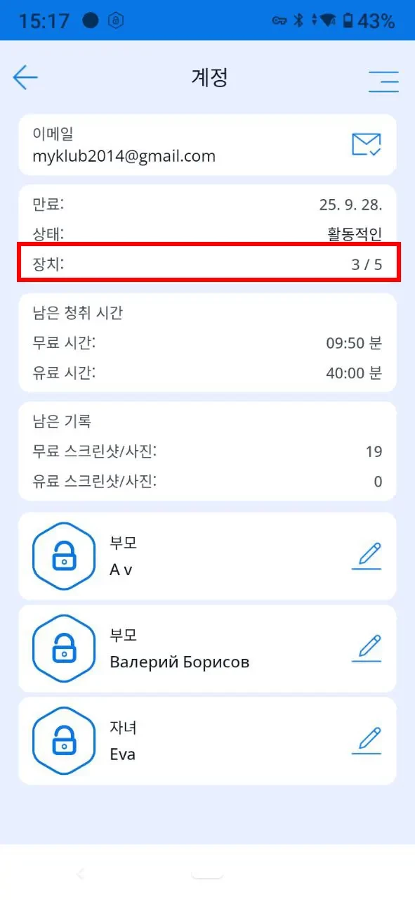 유료 구독을 연장한 후, 사용자는 "Kroha 자녀 보호 앱"을 다양한 역할로 5개의 기기에 어떤 조합으로든 연결할 수 있습니다. 예를 들면: 부모 4명과 자녀 1명, 부모 2명과 자녀 3명, 부모 1명과 자녀 4명 등입니다.