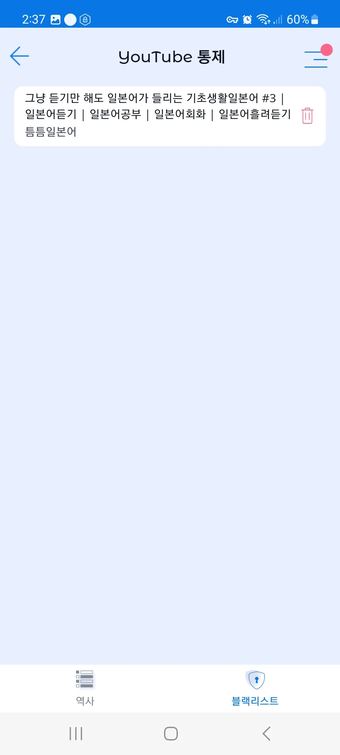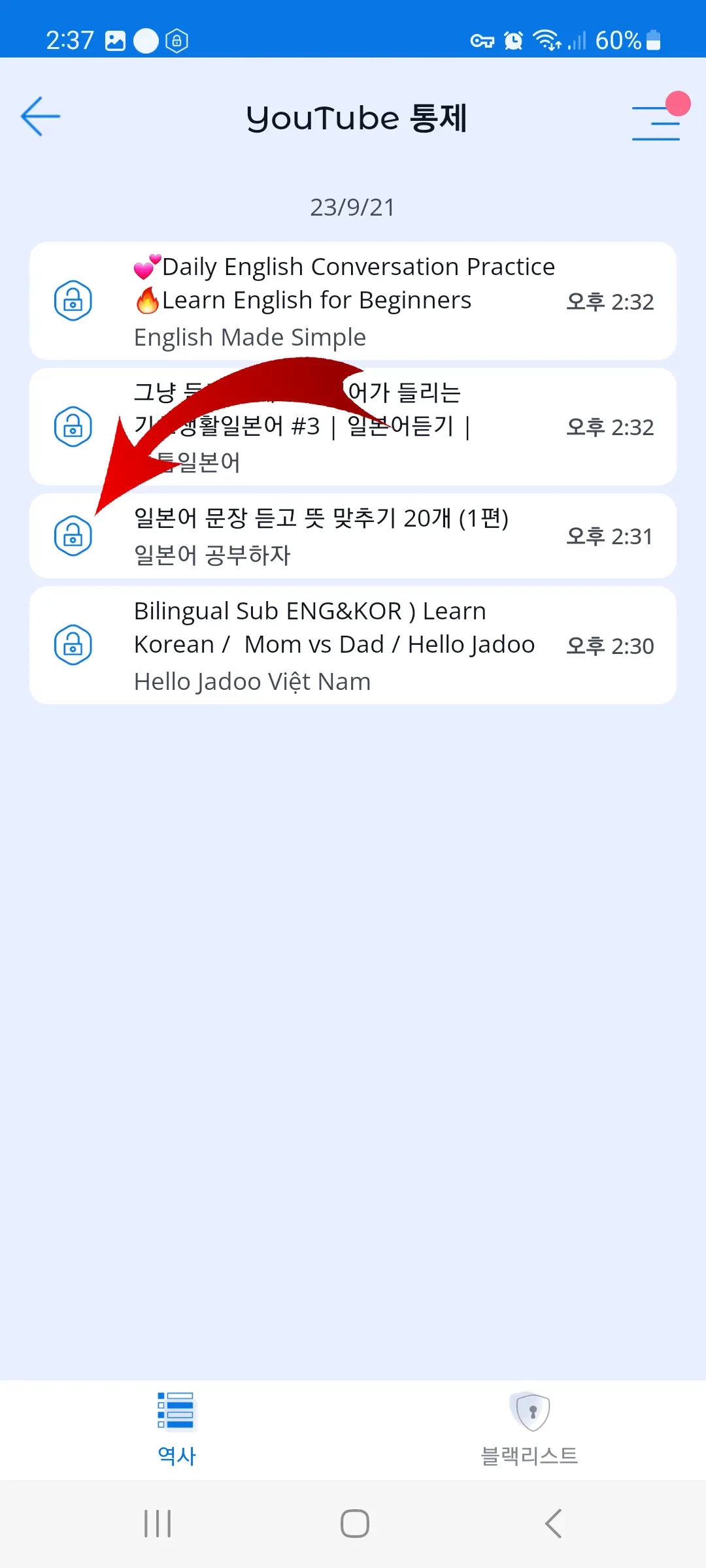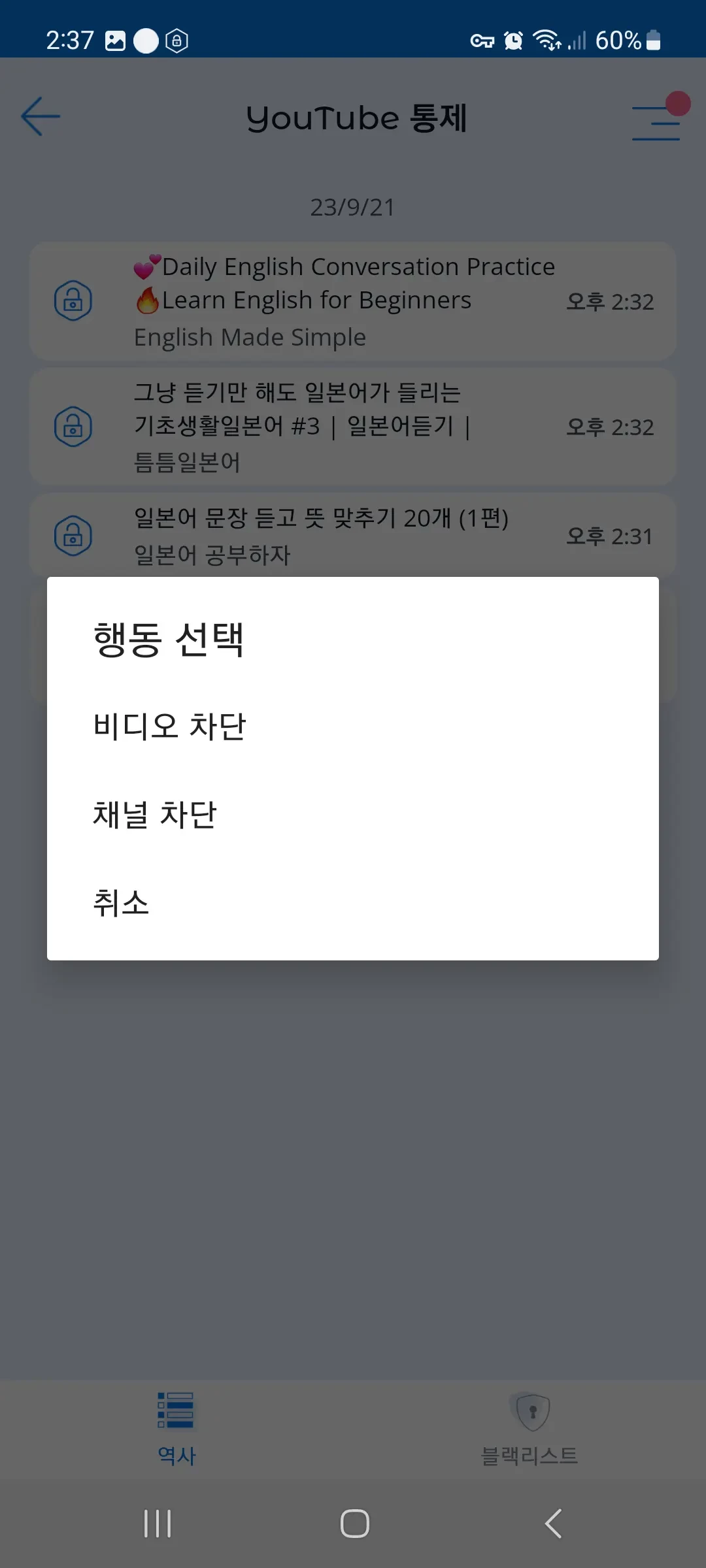 어린이가 시청한 YouTube 동영상 기록. 원하지 않는 YouTube 콘텐츠 차단 또는 YouTube 채널 차단, 블랙리스트 생성 옵션.