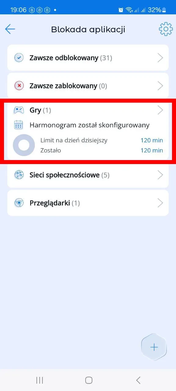 Na liście kategorii możesz zobaczyć ogólną liczbę aplikacji. Rodzic i dziecko mogą widzieć ograniczenia i czas pozostały na użycie w kategoriach z ustawionymi ograniczeniami.