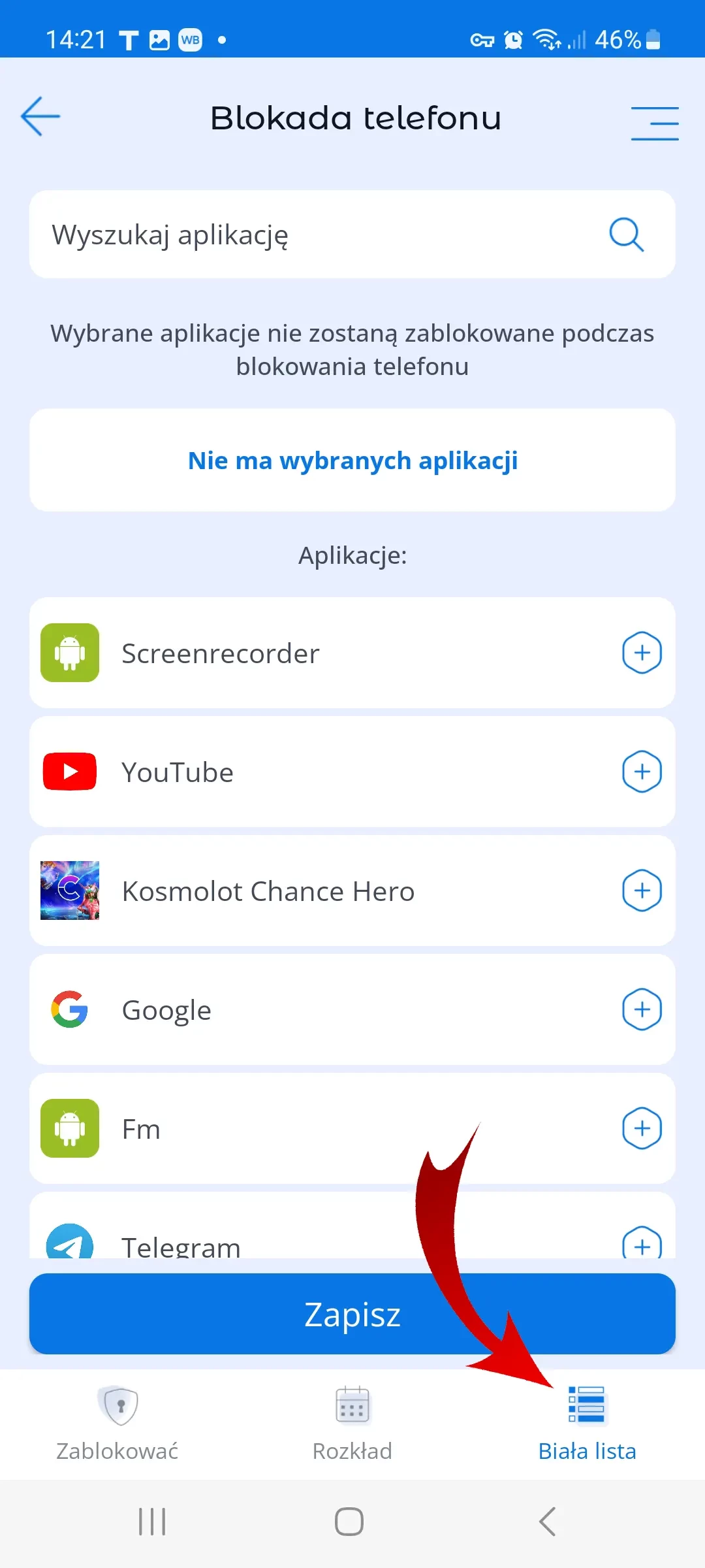 Jeśli rodzice chcą skorzystać z funkcji „Blokowanie telefonu”, ale trzeba, by pewne aplikacje działały, należy wnieść te aplikacje na białą listę i wtedy wszystkie aplikacje na smartfonie dziecka zostaną zablokowane oprócz aplikacji znajdujących się na dozwolonej „białej liście”.