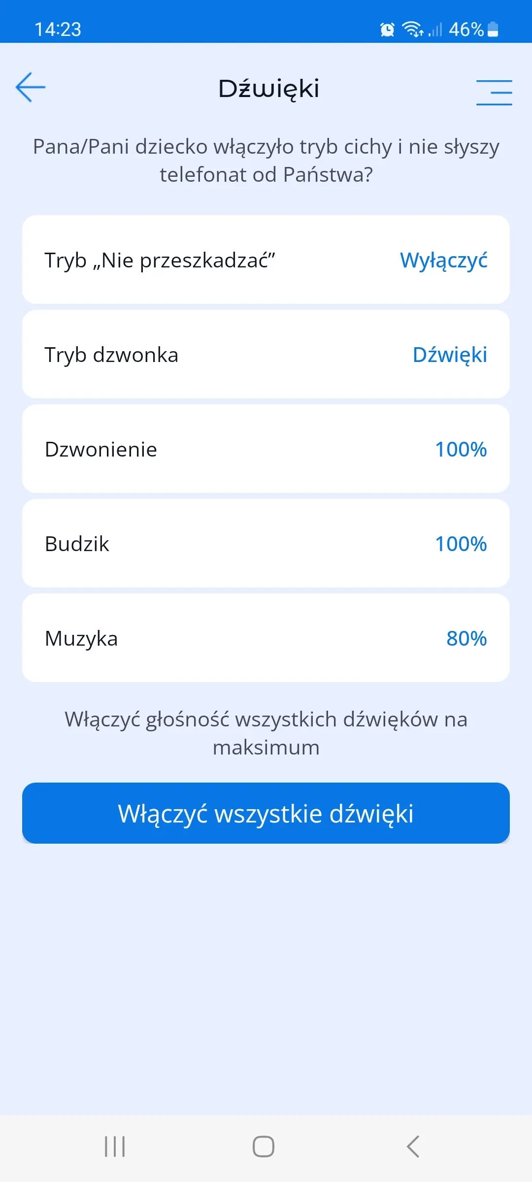 Tutaj można zdalnie odłączyć „Tryb cichy” na smartfonie dziecka, jeśli dziecko go włączyło, na przykład w szkole i zapomniało je wyłączyć. Rodzice będą mogli włączyć dźwięki na smartfonie dziecka, by dziecko usłyszało telefon.