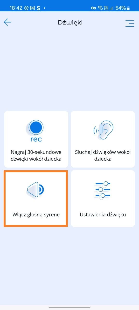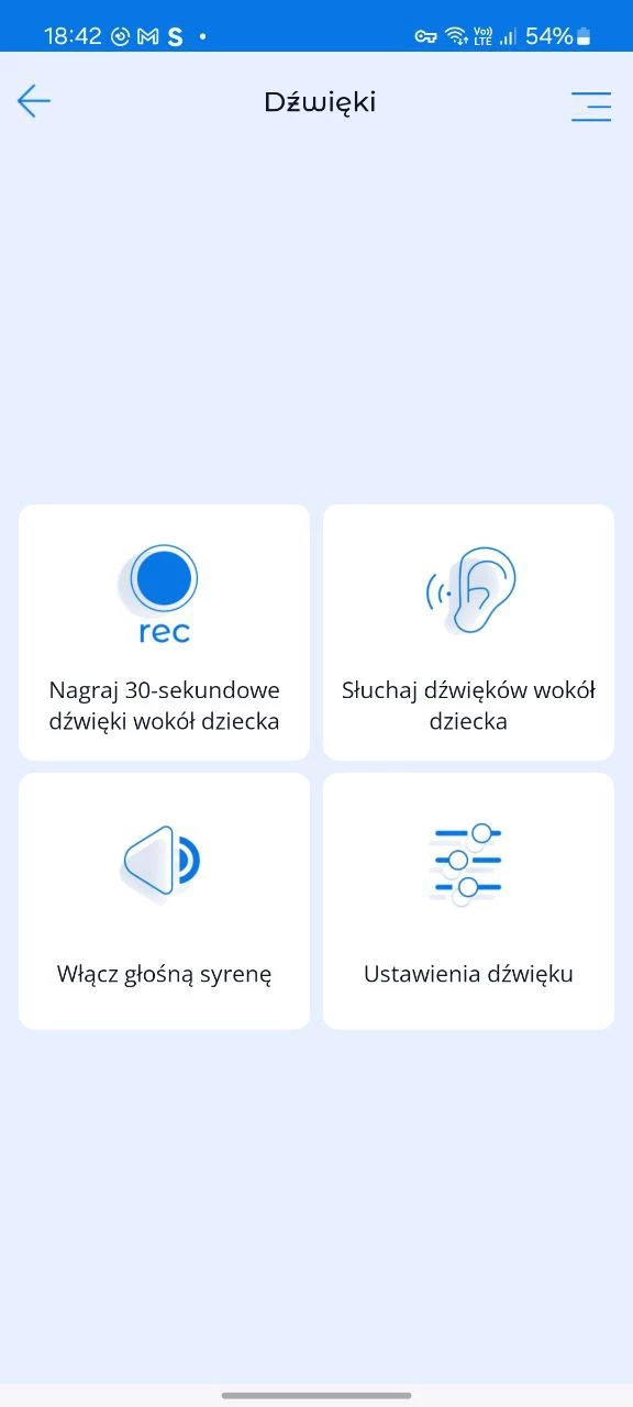 W rozdziale „Dźwięki” u rodziców jest możliwość: nagrywania 30-sekundowych dźwięków, słuchania dźwięku dookoła urządzenia dziecka, włączenia głośnego alarmu, włączenia dźwięku na urządzeniu dziecka.