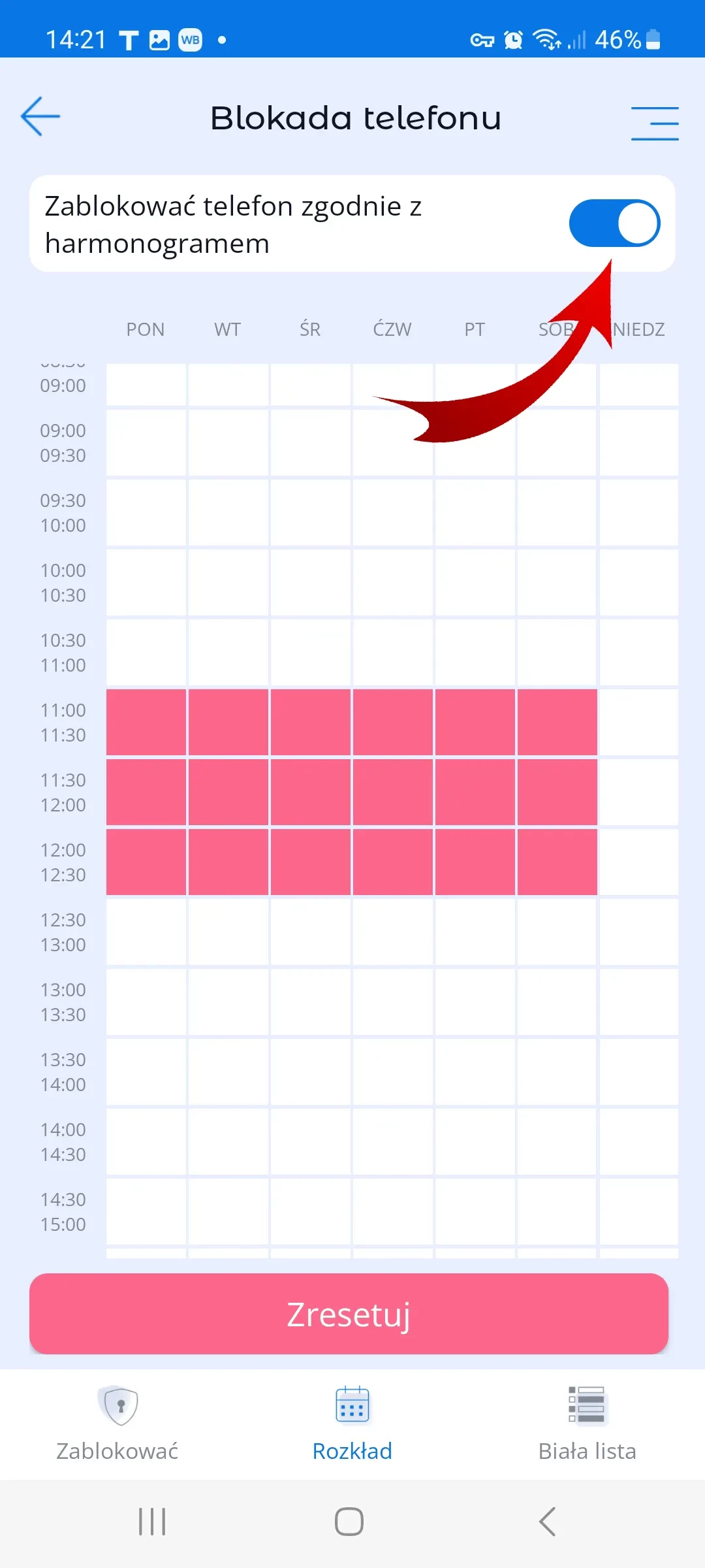 Aby zablokować pewny odstęp czasu, trzeba przycisnąć komórkę rozpoczęcia czasu blokowania i przeciągnąć palcem do potrzebnej komórki zakończenia odstępu czasu. Następnie włączyć funkcję w prawym górnym rogu menu Harmonogram. Czerwone komórki oznaczają, że w tym odstępie czasu smartfon dziecka pozostanie zablokowany.