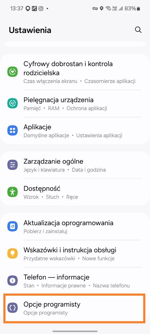 - Na dole wyświetli się rozdział „Parametry programisty”, naciśnij go.
