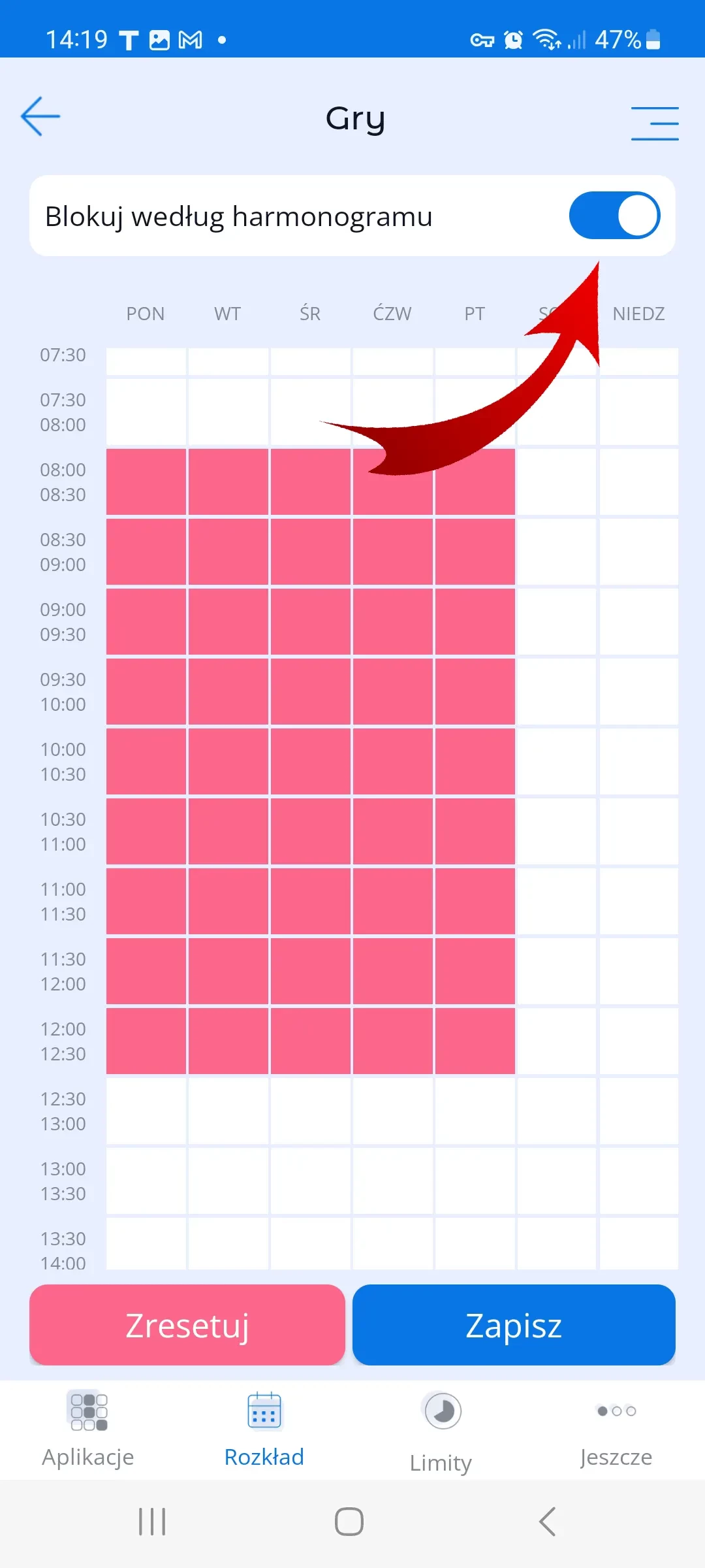 Aby ustawić harmonogram w funkcji „Blokowanie aplikacji”, rodzice ustawiają blokowanie programów na okres, gdy dziecko nie powinno odrywać się na gry, oglądanie filmików lub rozmowy w sieciach społecznościowych (na przykład w szkole). Zablokuj potrzebny czas, przyciskając komórkę rozpoczęcia okresu i wydzielając komórki do zakończenia okresu blokowania. Włącz przełącznik „Blokowanie według harmonogramu”. Czas odpowiadający wydzielonym komórkom zostanie zablokowany dla aplikacji w wybranej kategorii.