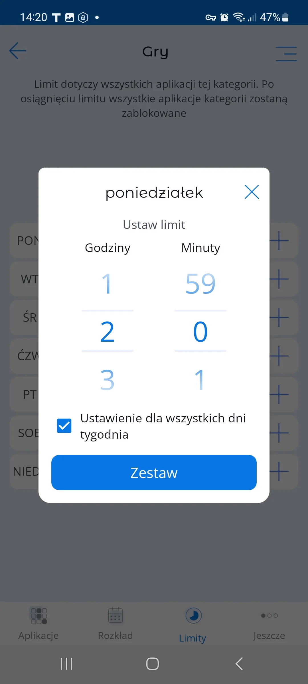 Aby ustawić limit, wybierz dzień tygodnia i ustaw czas, na który chcesz ograniczyć używanie aplikacji na dobę. Możesz od razu ustawić to ograniczenie na wszystkie dni tygodnia, ustawiając odpowiedni parametr.