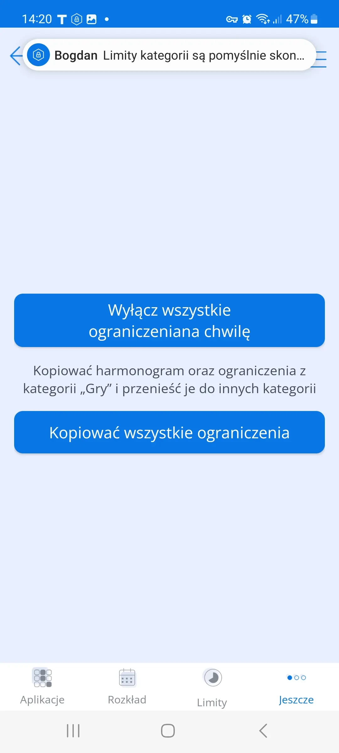 Gdy limit się skończył, a rodzice chcą dać dziecku trochę więcej czasu na gry, przy naciśnięciu opcji „Odłącz wszystkie ograniczenia na pewien czas” w menu dodatkowym „Dodatkowo” można odłączyć blokowania na dowolny odstęp czasu. Aby ułatwić ustawienie, w tym samym menu można powielić ustawione ograniczenia również na inne kategorie.