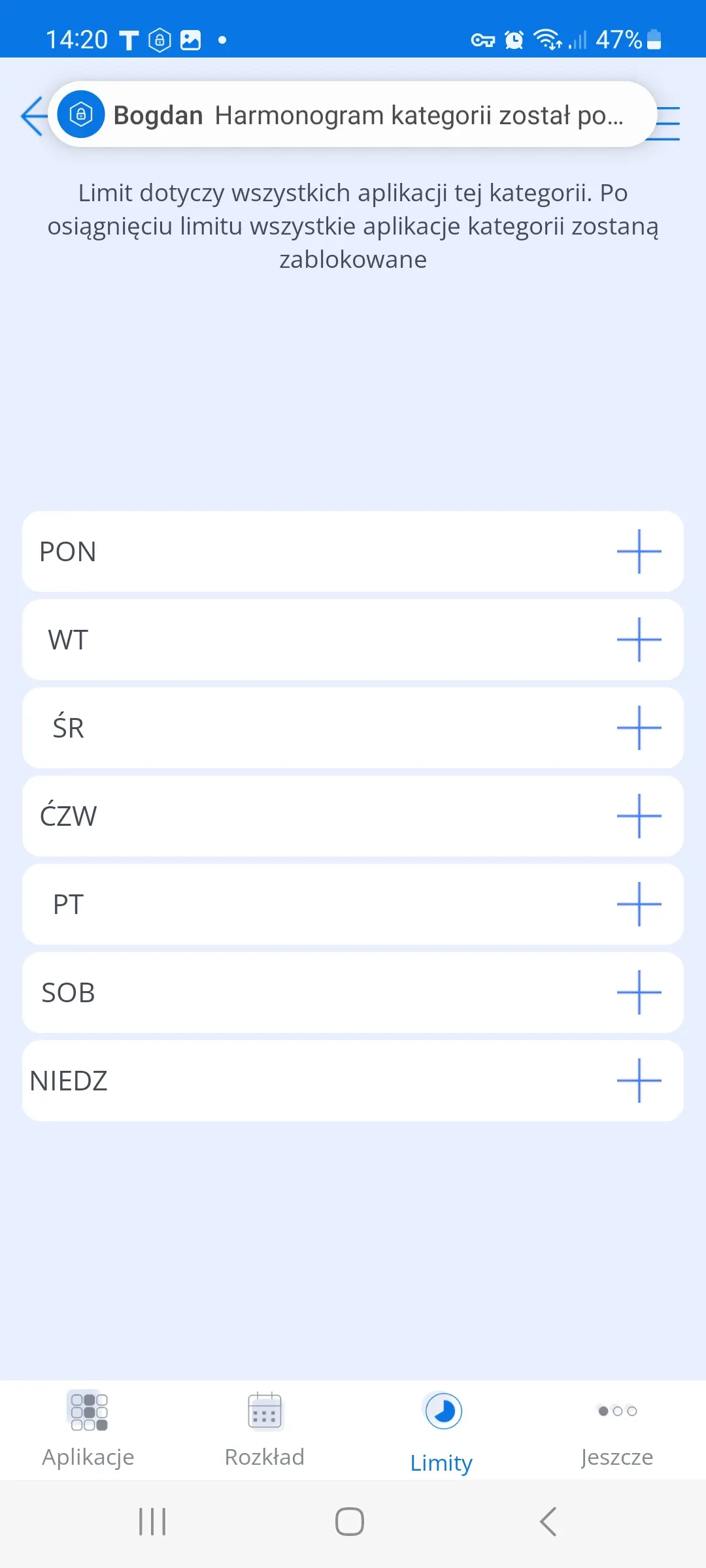 Aby ustawić limit, naciśnij „+” obok potrzebnego dnia tygodnia i podaj dozwolony czas na używanie tej kategorii na dobę. Możesz wybrać opcję „Ustaw na wszystkie dni tygodnia” i limit zostanie od razu ustawiony na wszystkie dni tygodnia.