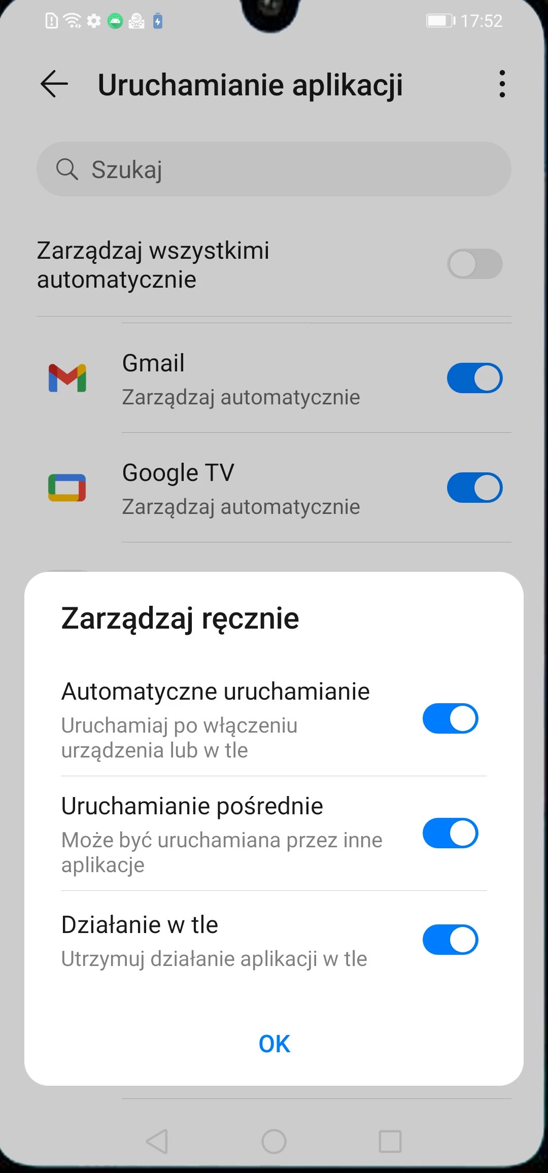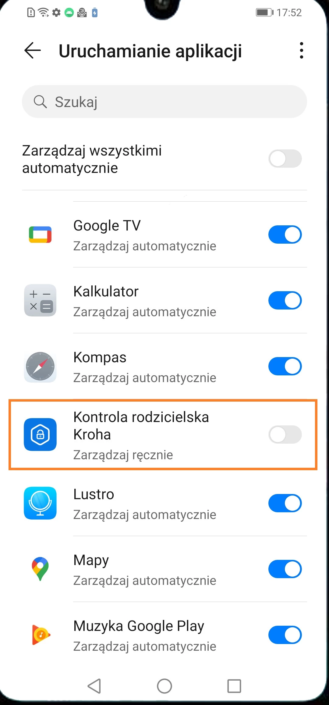 - Otwórz aplikację „Ustawienia” w telefonie > otwórz rozdział „Bateria” > otwórz rozdział „Uruchamianie” > znajdź aplikację „Parental Control Kroha” > wyłącz przełącznik naprzeciwko nazwie aplikacji „Parental Control Kroha” > pojawi się okno „Zarządzanie ręczne”. W tym oknie wszystkie przełączniki muszą być włączone: „Automatyczne uruchamianie”, „Pośrednie uruchamianie”, „Działanie w tle”.