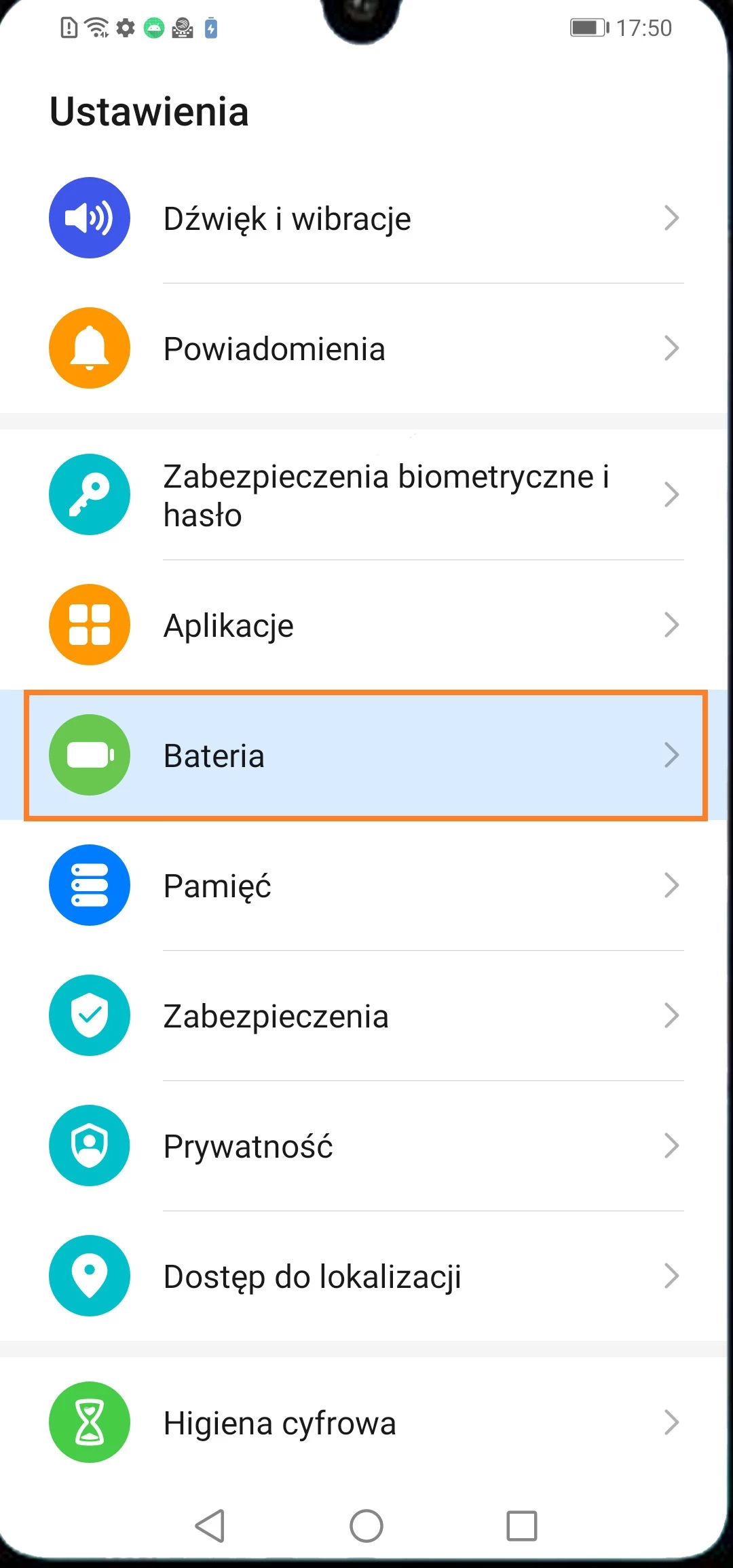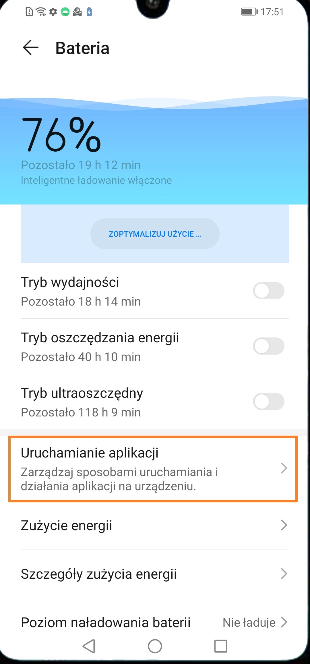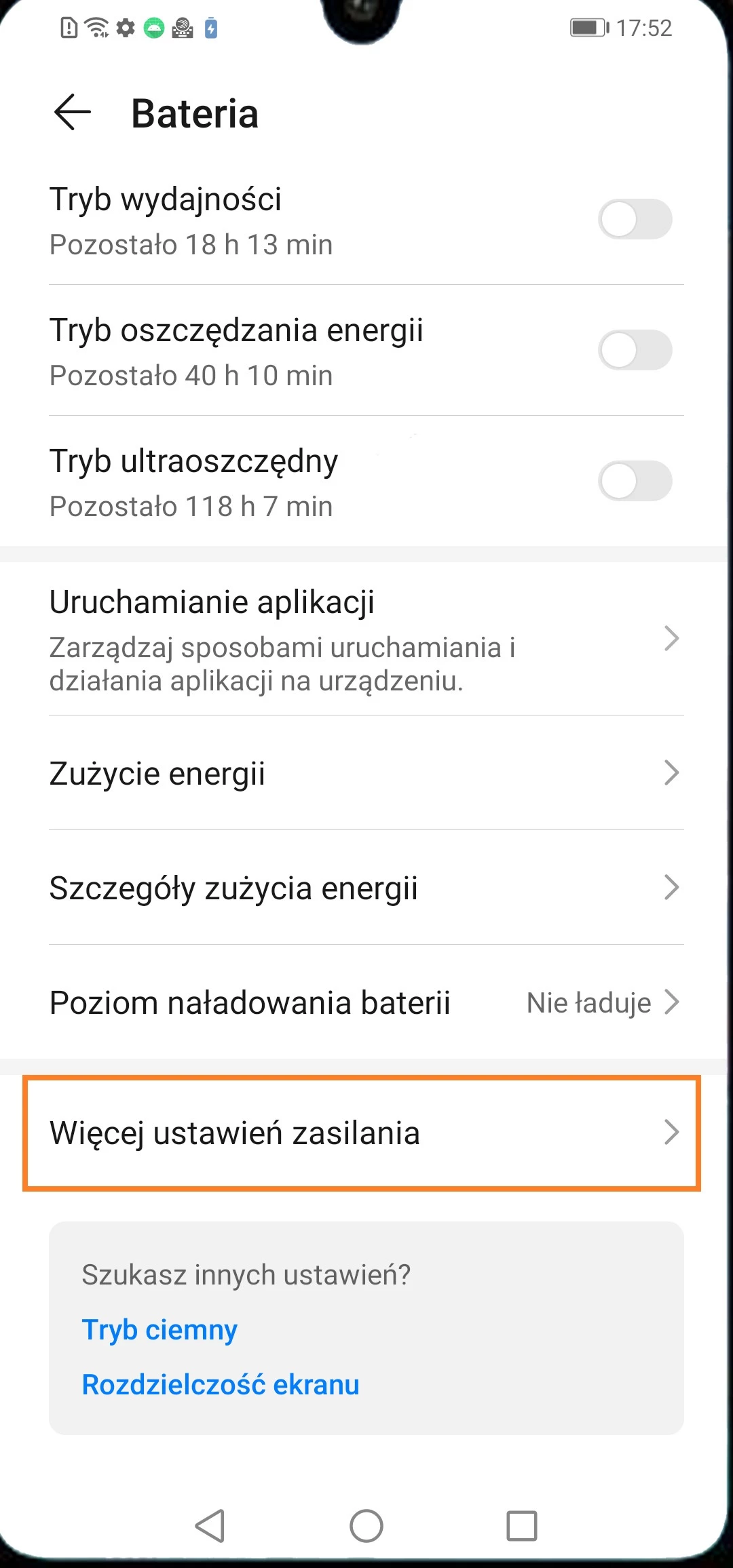 - Wróć do rozdziału „Bateria” > otwórz rozdział „Pozostałe ustawienia baterii” (w przypadku innego oprogramowania w prawym górnym rogu naciśnij na ikonę ustawień) > wyłącz powiadomienie o wykrywaniu energochłonnych aplikacji.