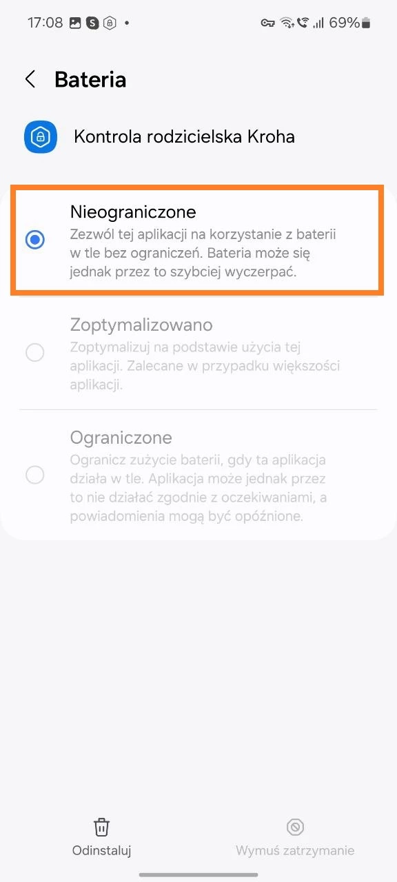 Jak zapewnić działanie Parental Control Kroha w tle na Samsung (Android 12 - 14)?