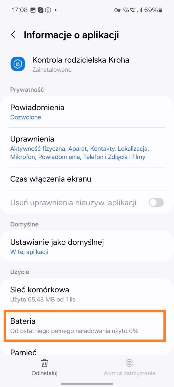 - Otwórz „Ustawienia” na urządzeniu dziecka > Aplikacje > Parental Control Kroha > Akumulator (Bateria) > Nie optymalizuj.