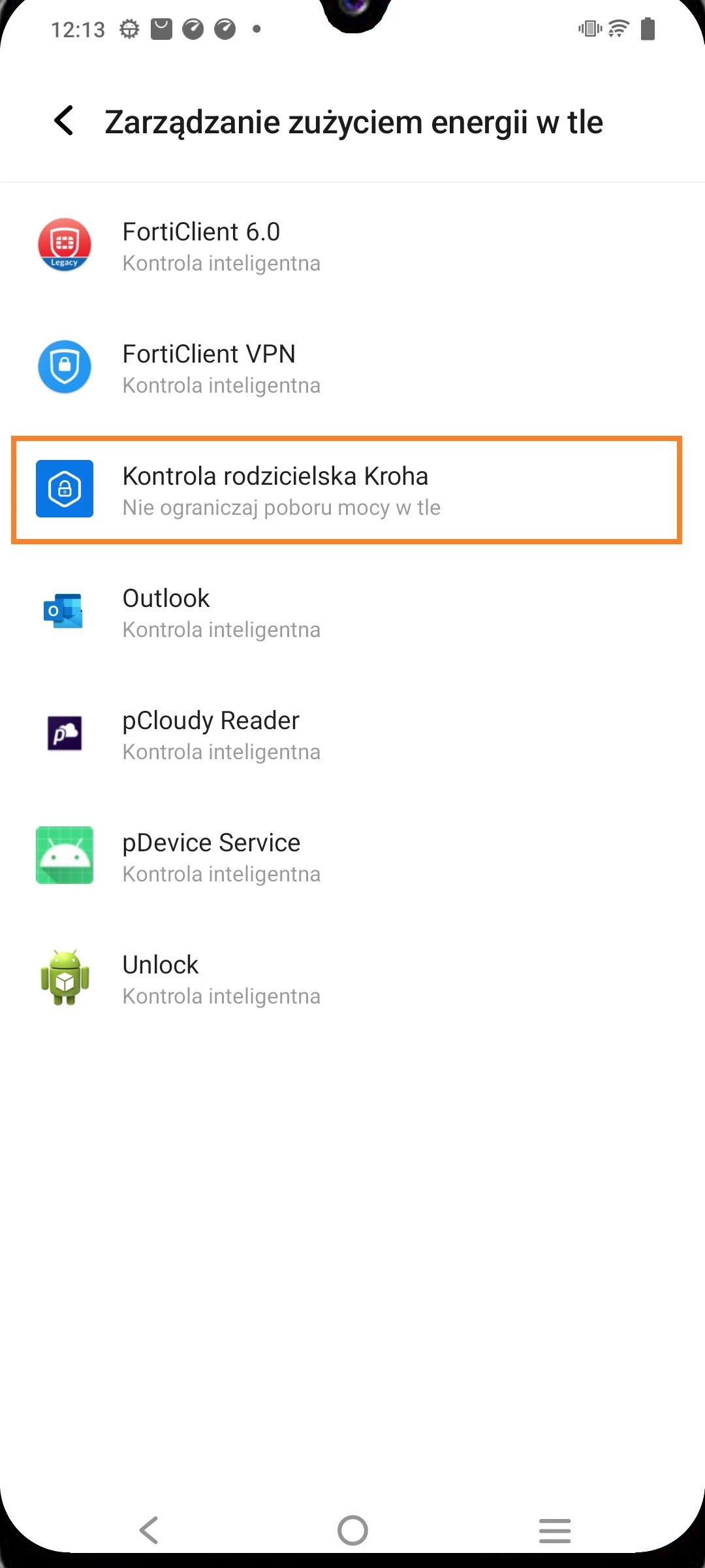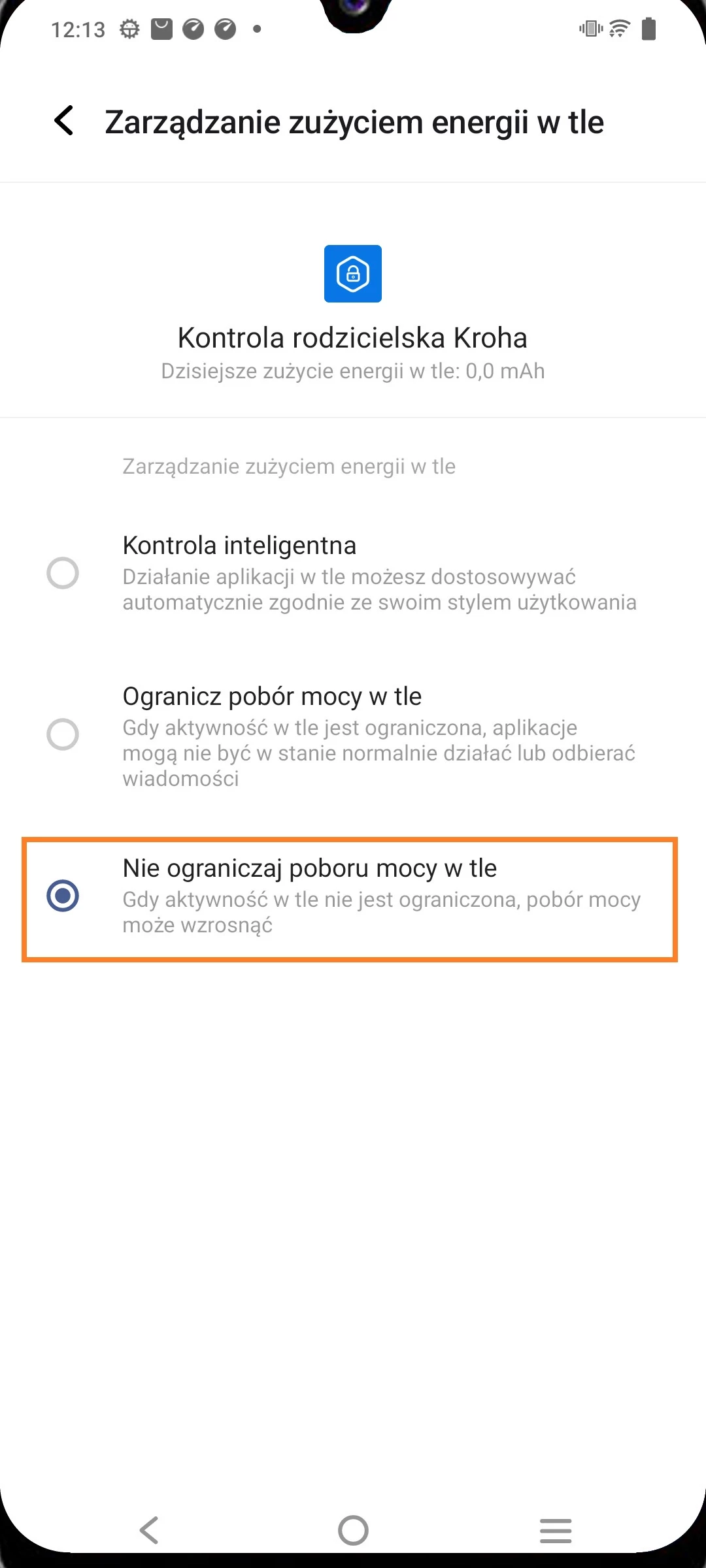 - Otwórz Ustawienia na urządzeniu dziecka > Bateria > Wysokie zużywanie energii w tle (Na telefonach z Funtouch OS o wersji poniżej 3.0 wejdź do iManager > Zarządzanie zużywaniem energii > Wysokie zużywanie energii), znajdź aplikację Parental Control Kroha i włącz ją (zezwól na działanie w tle).