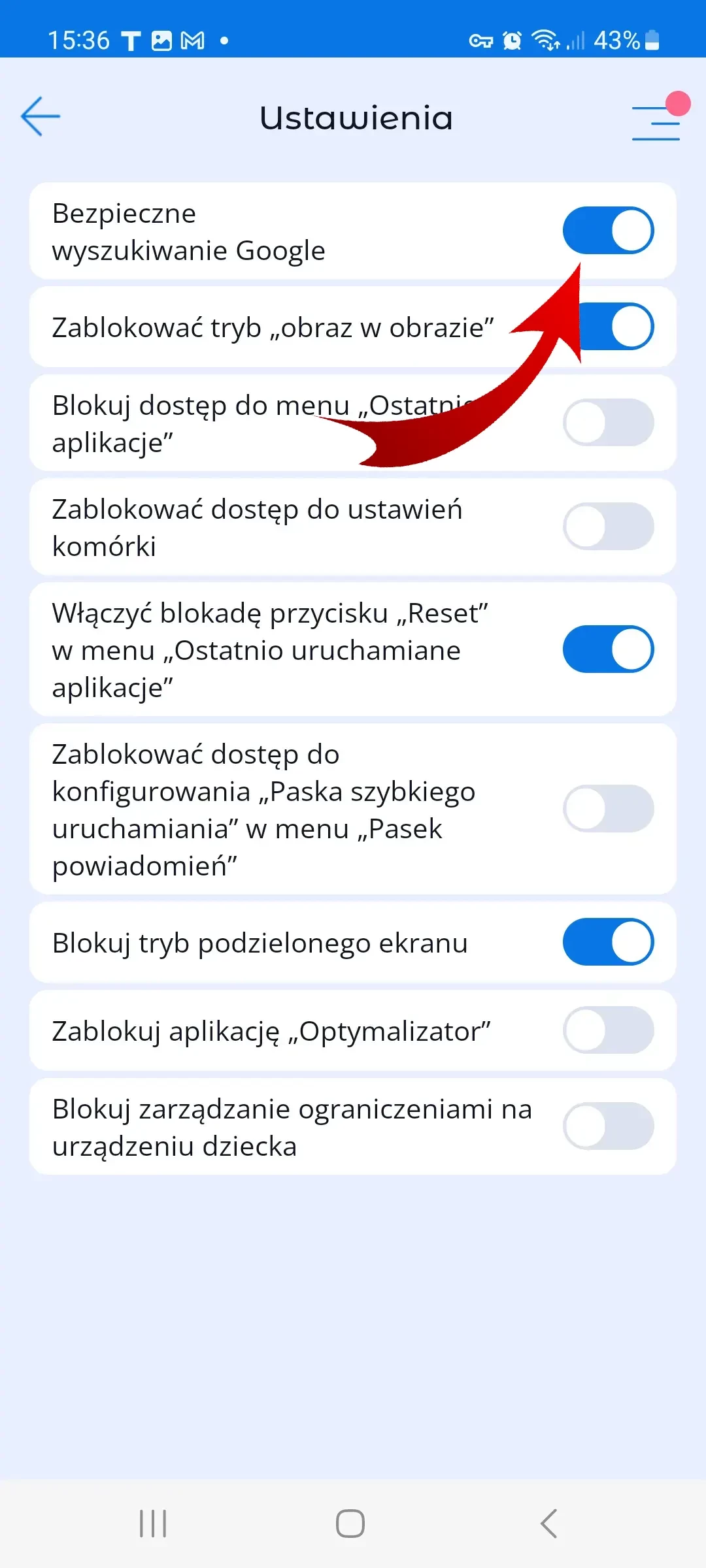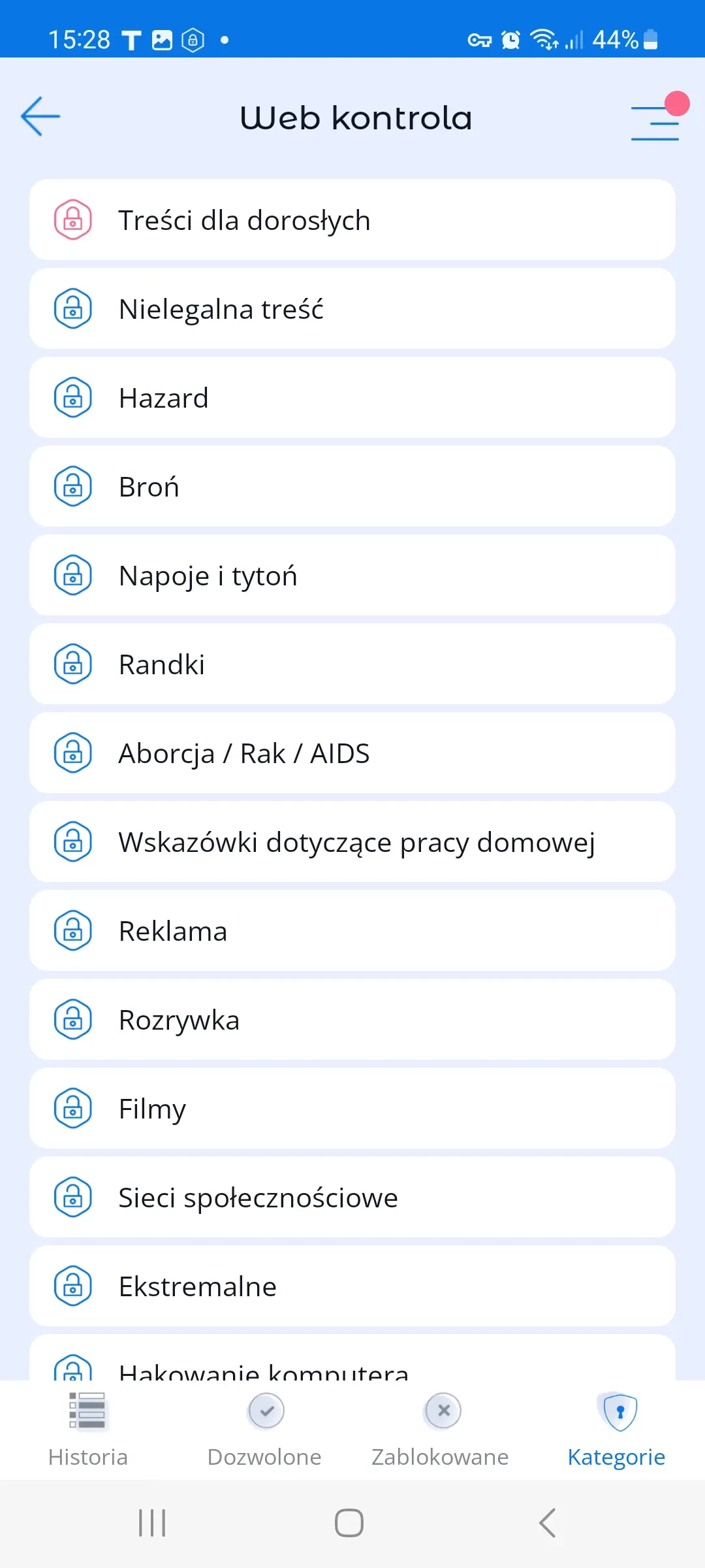 - blokowanie niepożądanych kategorii stron internetowych, na przykład „treści dla dorosłych”;
