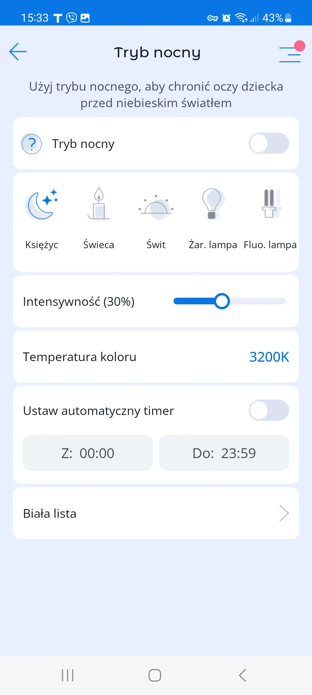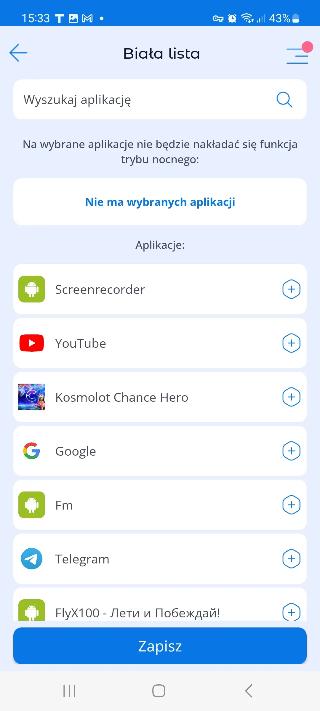 Biała lista – jeśli nie chcesz, by funkcja Tryb nocny działała dla jakichś określonych aplikacji, można je dodać na białą listę i funkcja Tryb nocny będzie się wyłączać przy uruchamianiu tych aplikacji.