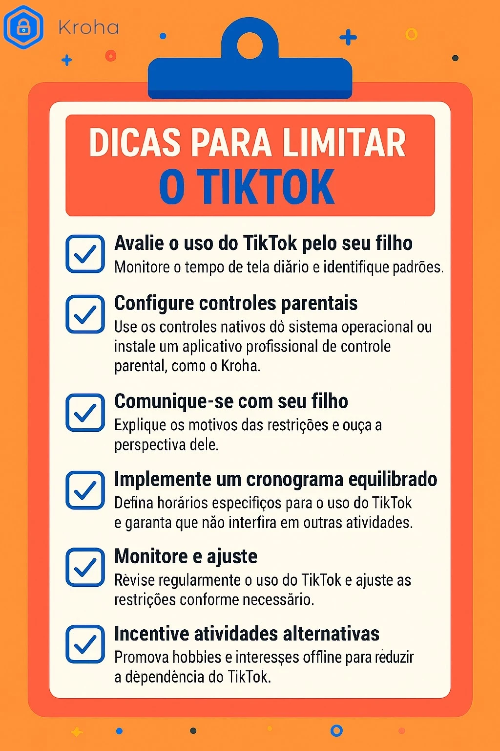 Use aplicativos como o Kroha para configurar horários em que o TikTok fica bloqueado, como durante o horário escolar ou à noite. Isso ajuda a garantir que o uso do aplicativo não interfira nas responsabilidades diárias e no sono.