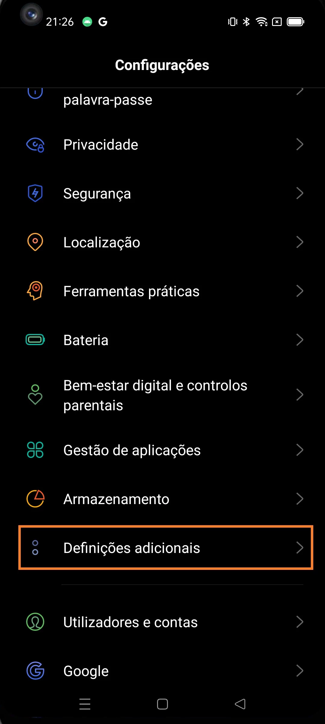 - Vá para a seção "Definições adicionais" (ou "Sistema");