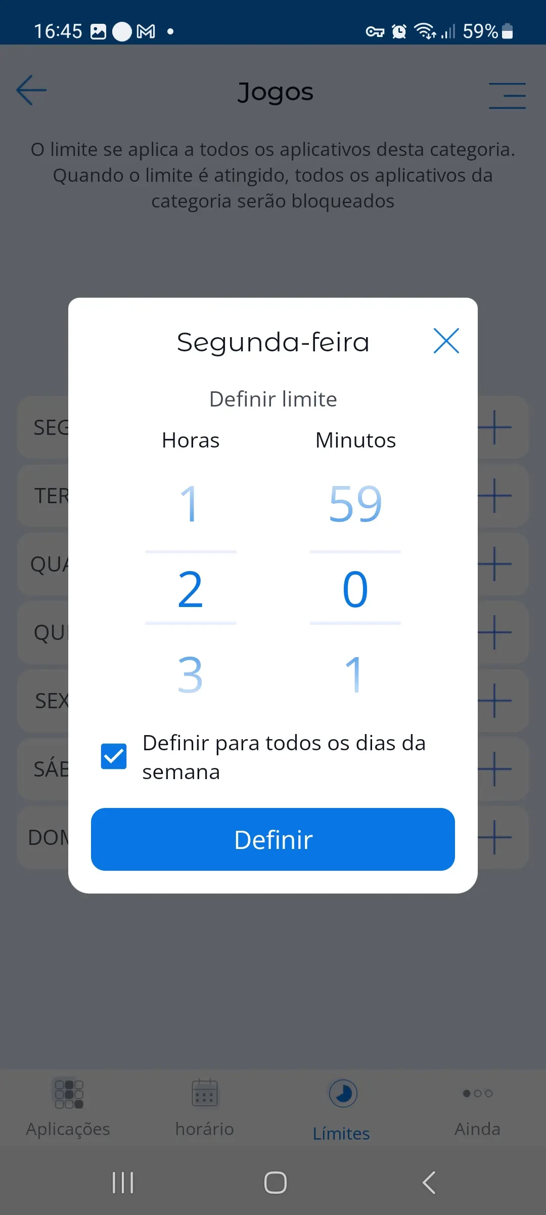 Para definir o limite, clique em '+' ao lado do dia da semana relevante e especifique o tempo permitido para usar essa categoria por dia. Você pode selecionar a opção "Definir para todos os dias da semana" e o limite será definido para todos os dias da semana de uma vez.