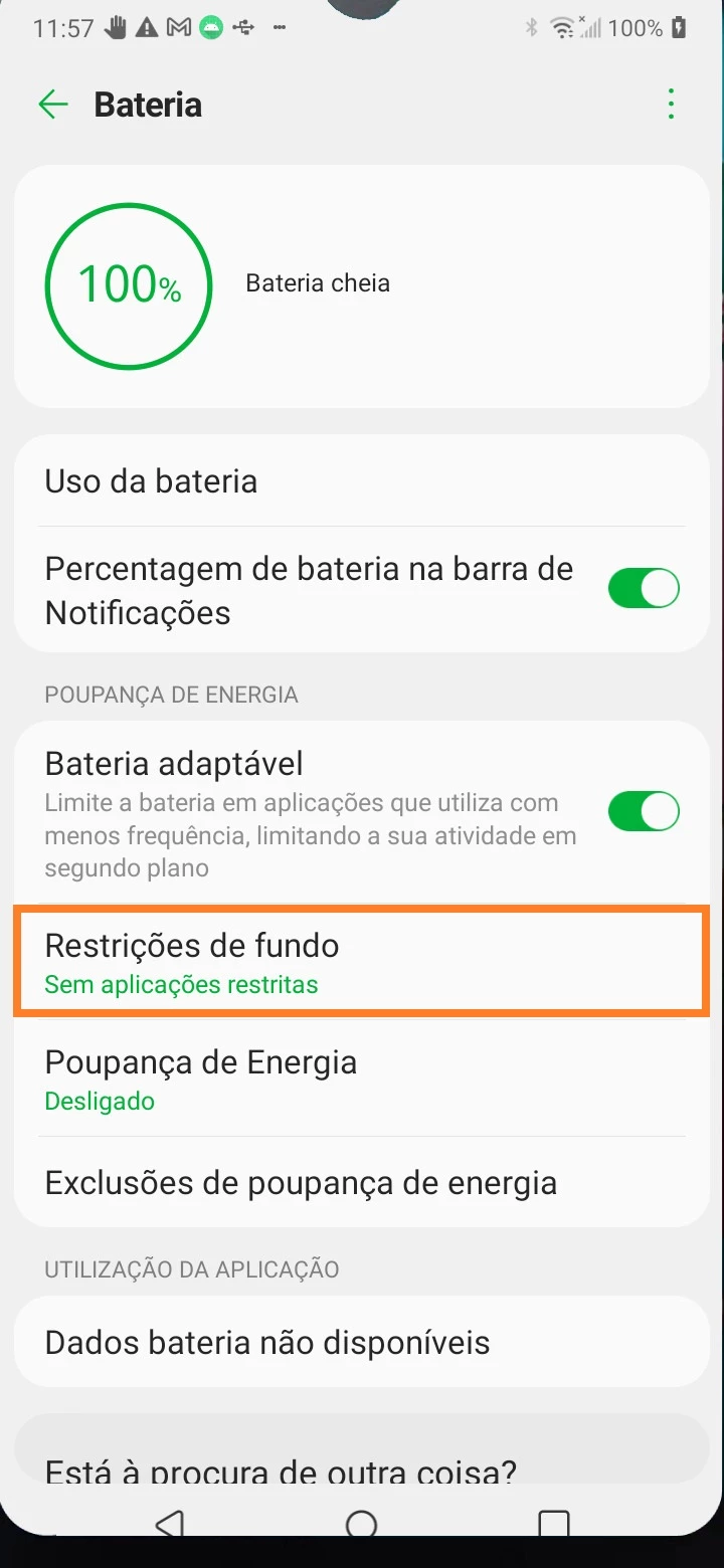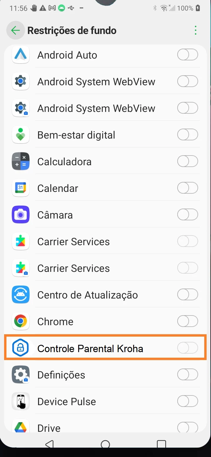 - Abra Configurações no dispositivo do seu filho > Bateria > Restrições de Fundo > Certifique-se de que nenhuma restrição esteja ativada para o app controlo parental Kroha (o botão deve estar na posição inativa).