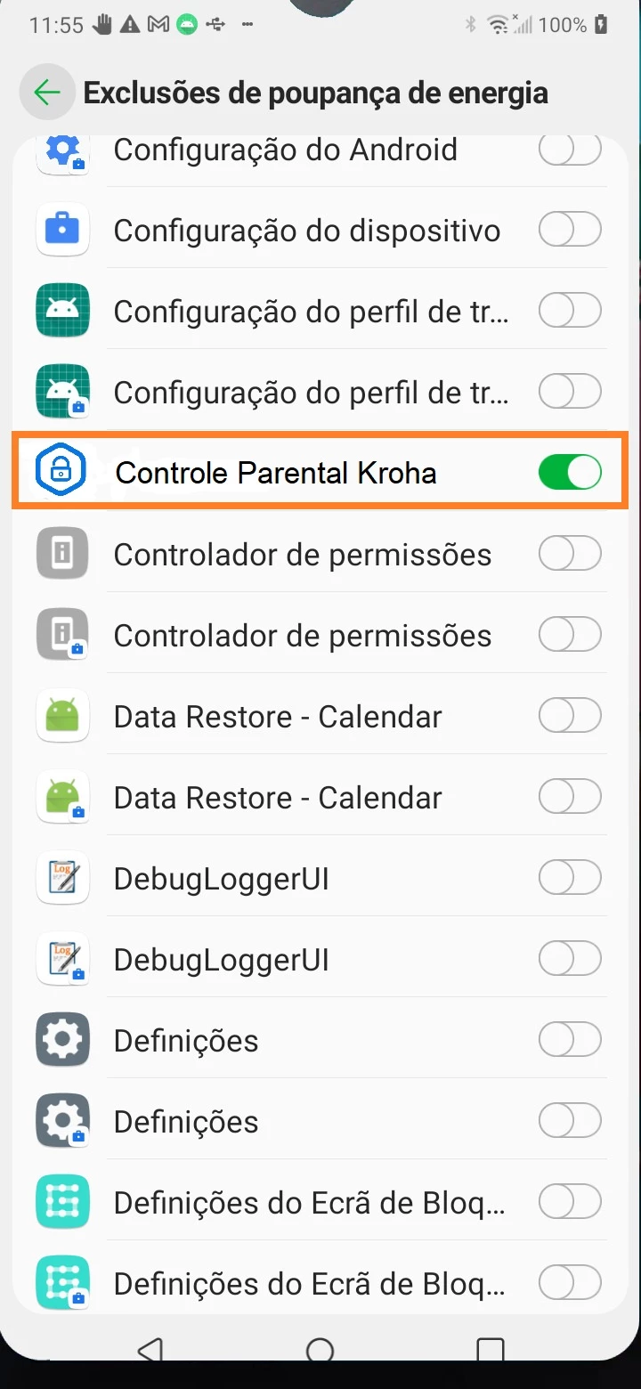 - Abra Configurações no dispositivo do seu filho > Bateria > Exclusões do Modo de Economia de Energia > Encontre o app controlo parental Kroha na lista de apps > E ative o interruptor para excluir o app controlo parental Kroha do modo de otimização de bateria.