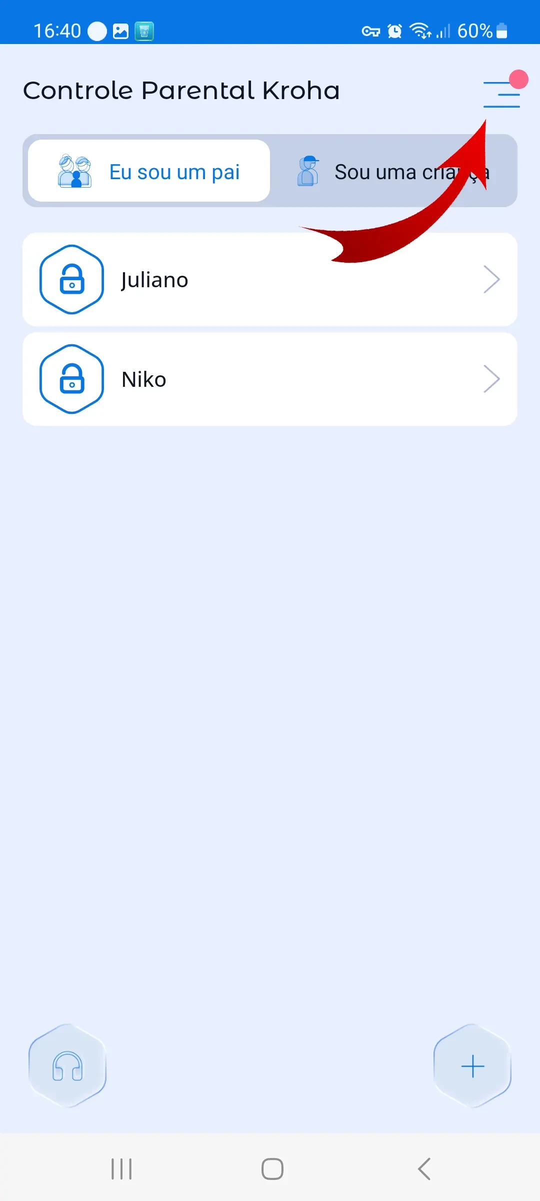 - Abrir o aplicativo de controle parental Kroha;