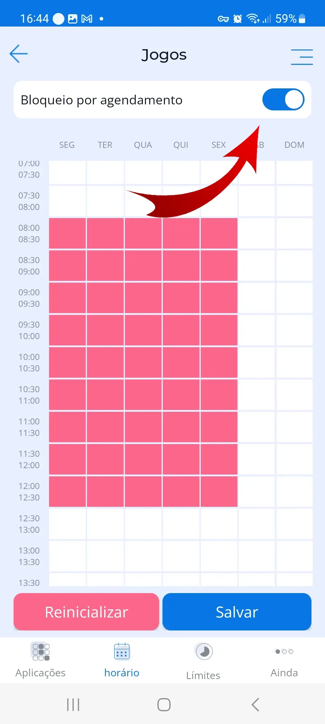 Para definir um horário no recurso de “Bloqueio de Aplicativos”, os pais configuram bloqueios de aplicativos por um período de tempo em que a criança não deve se distrair jogando, assistindo a vídeos ou se comunicando nas redes sociais (por exemplo, na escola). Bloqueie o período de tempo desejado apertando a célula no início do período e arrastando a seleção da célula até o final do período de bloqueio. Ative a alternância “Bloqueio Programado”. O horário correspondente às células selecionadas será bloqueado para aplicações da categoria selecionada.