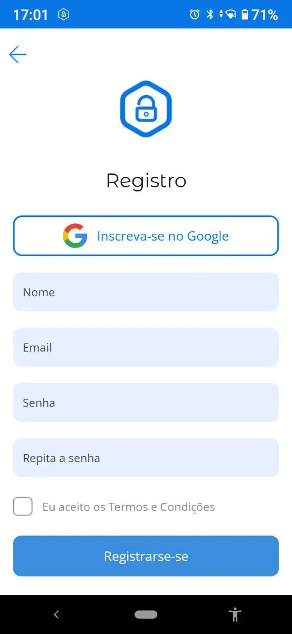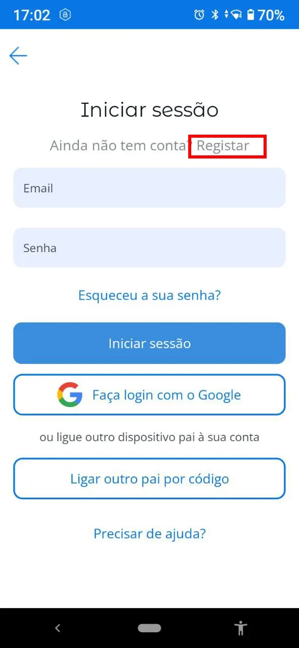 3. Na tela "Registrar", você pode se registrar com uma conta Apple, conta Google, ou inserir seu nome, endereço de e-mail e criar uma senha.