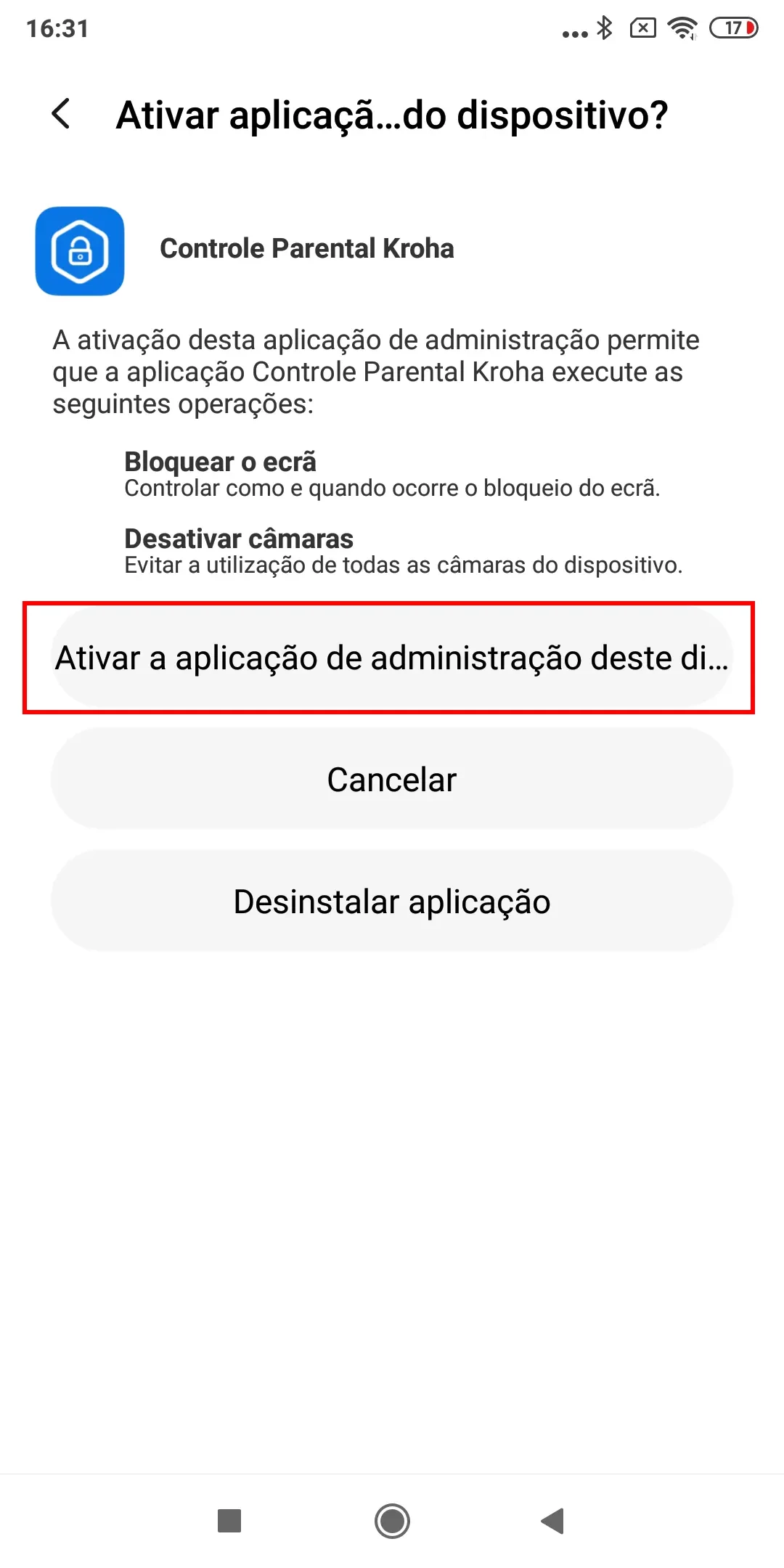 “Proteção contra desinstalação”: ative o modo administrador para o aplicativo controle dos pais Kroha. Isso impedirá que seu filho exclua o aplicativo do dispositivo sem inserir o código PIN, leia o guia passo a passo para detalhes e toque em “Permitir”;