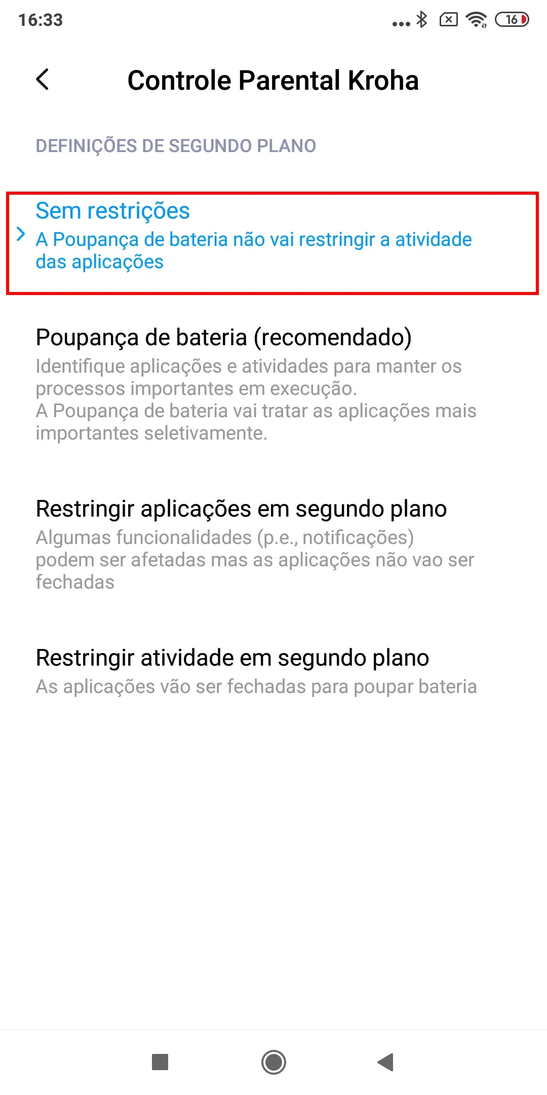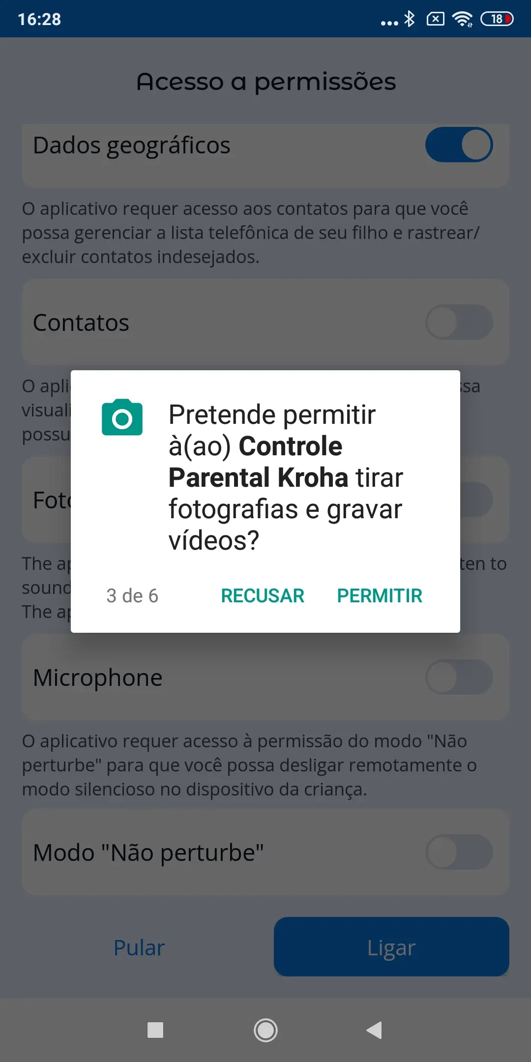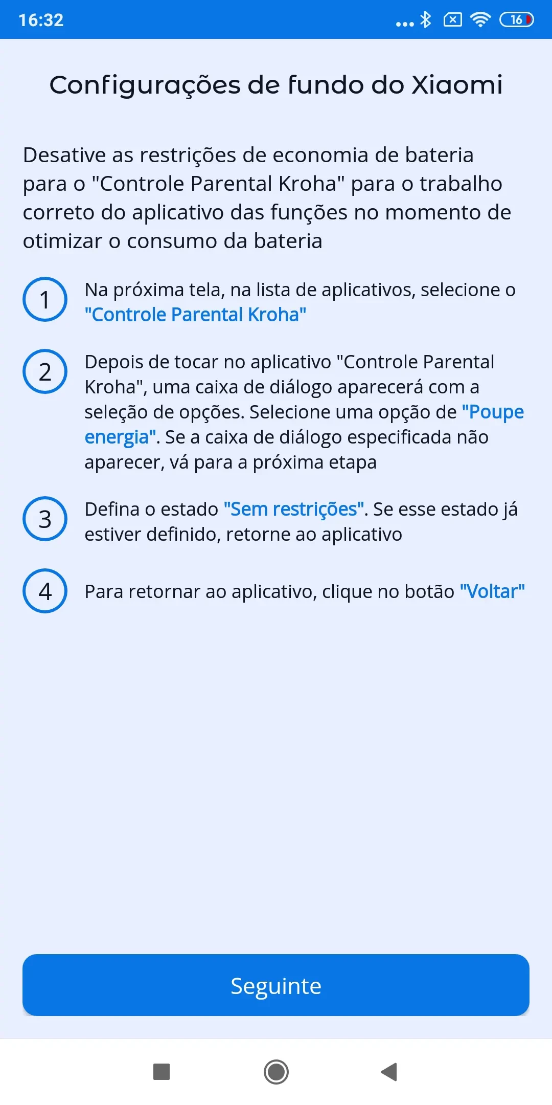 “Otimização de bateria”, para o correto funcionamento do aplicativo você precisa desativar a otimização de bateria para o aplicativo controle dos pais Kroha, leia o guia passo a passo para detalhes e toque em “Próximo”;