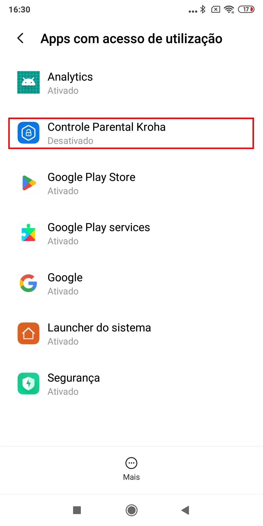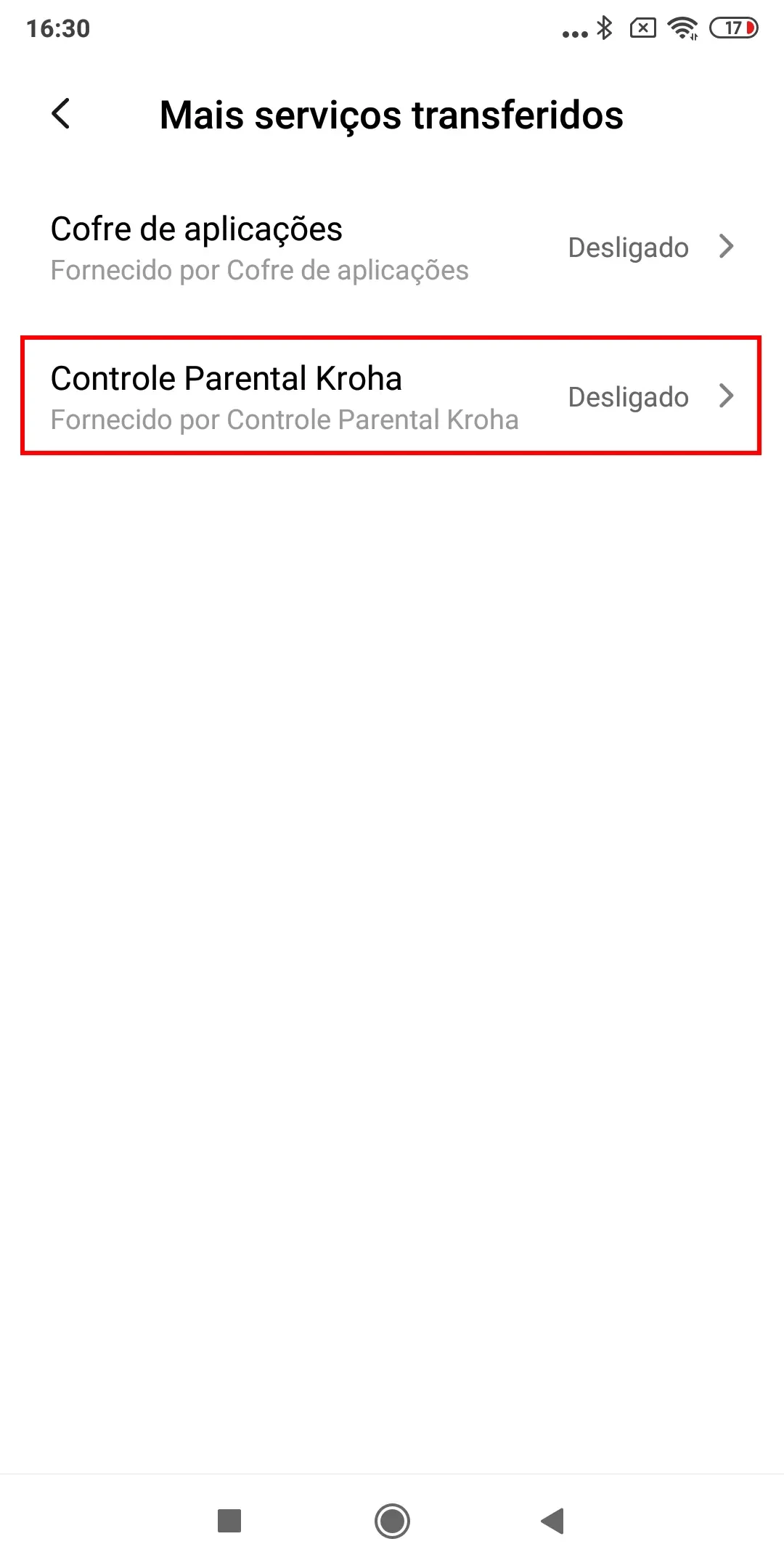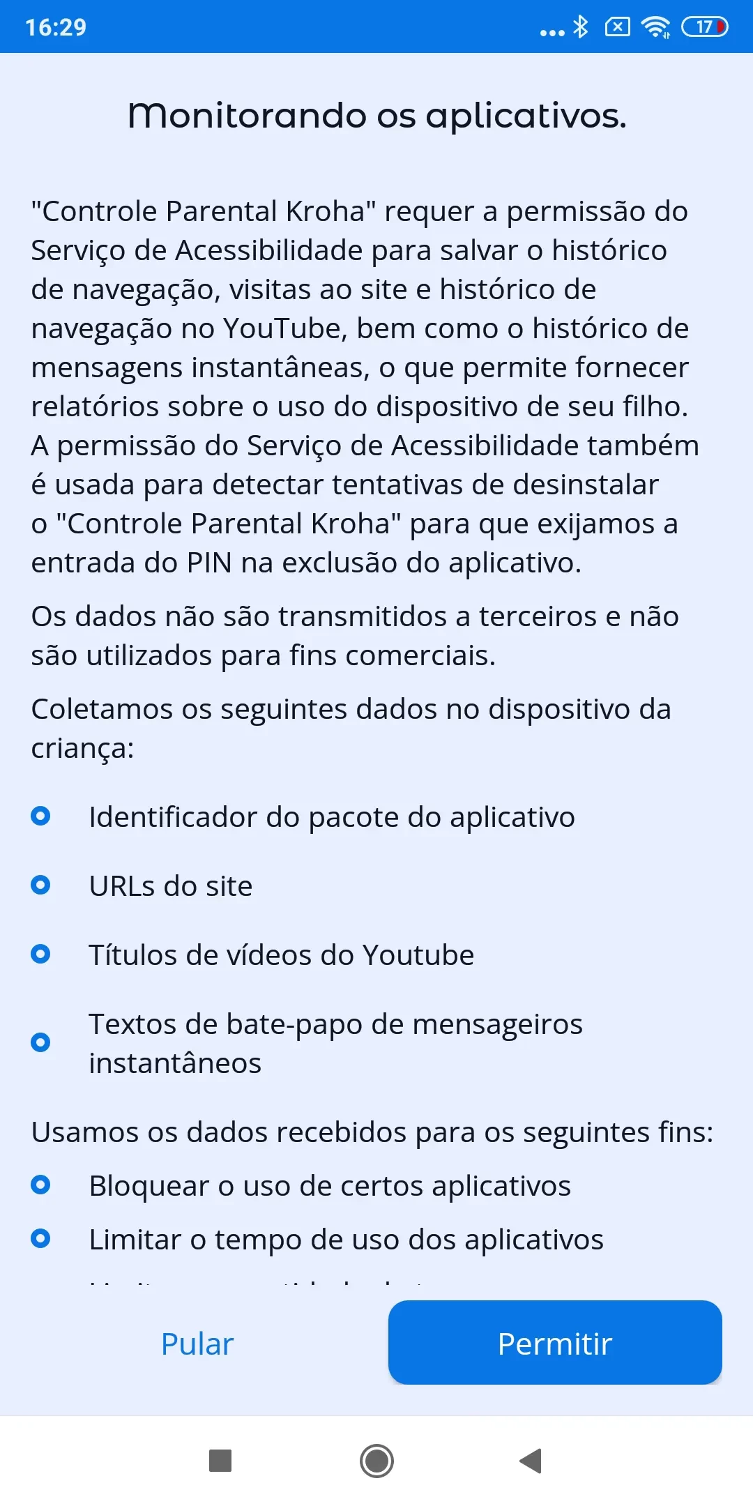 “Otimização de bateria”, para o correto funcionamento do aplicativo você precisa desativar a otimização de bateria para o aplicativo controle dos pais Kroha, leia o guia passo a passo para detalhes e toque em “Próximo”;