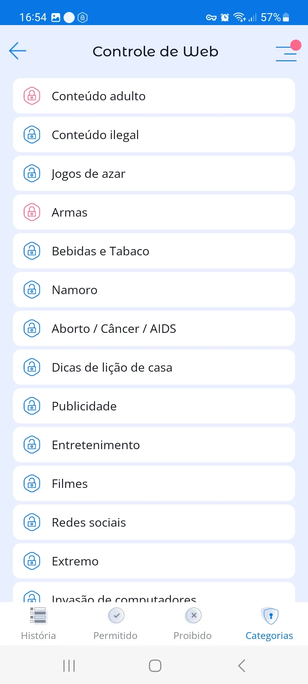 - Bloqueio de categorias indesejadas de sites, por exemplo, "conteúdo adulto";