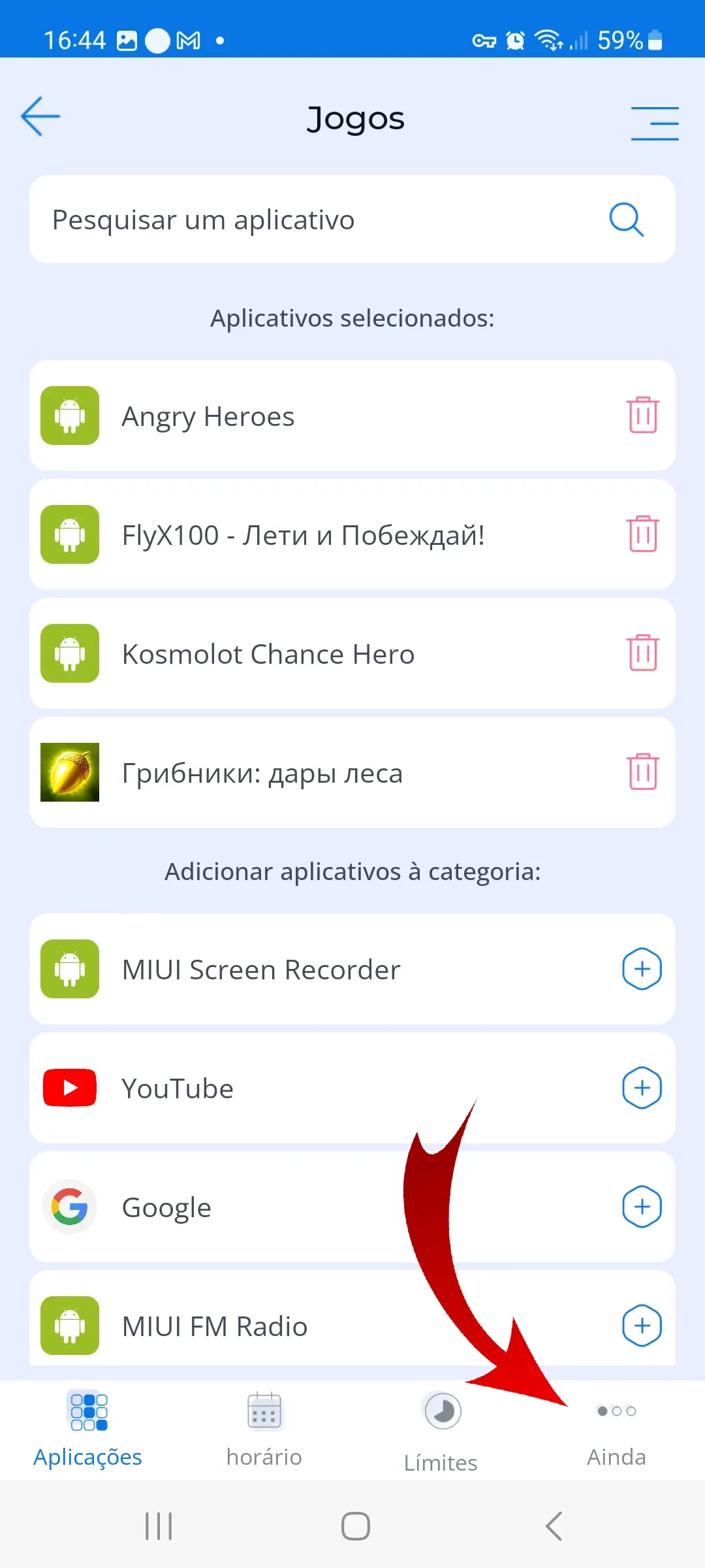 Na seção "Bloqueio de Aplicativos", os pais podem editar o limite de tempo de ecrã que foi definido. As configurações do app Controle dos Pais Kroha permitem aos pais aumentar o tempo para jogos ou outras atividades divertidas quando o limite já foi atingido. No menu adicional (três pontos no canto inferior direito), você pode desativar as restrições para uma categoria selecionada de aplicativos por um período específico de tempo.