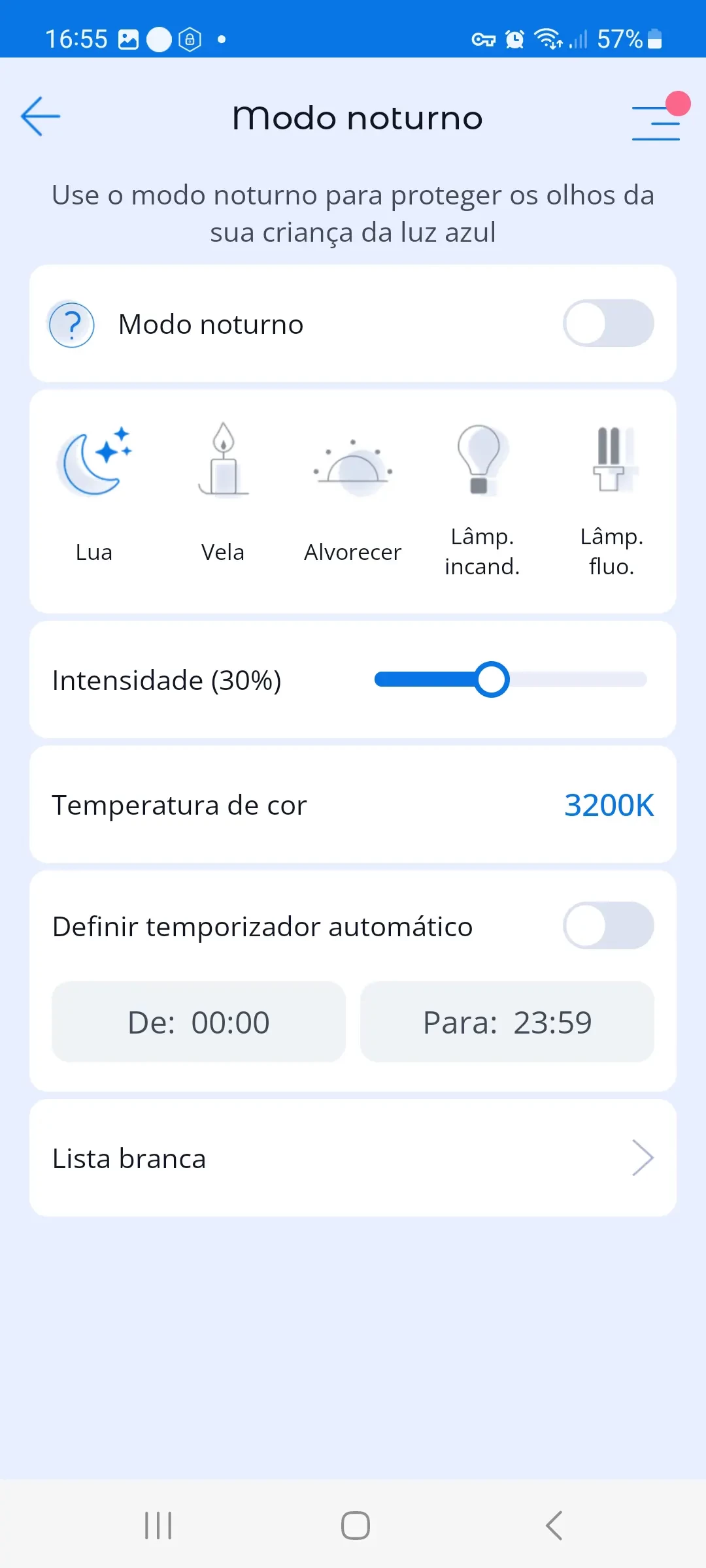 Lista de permissões: Se você não quiser que a funcionalidade Modo Noturno funcione para certos aplicativos, pode adicioná-los a uma lista de permissões e a funcionalidade Modo Noturno será desativada quando esses aplicativos forem lançados.