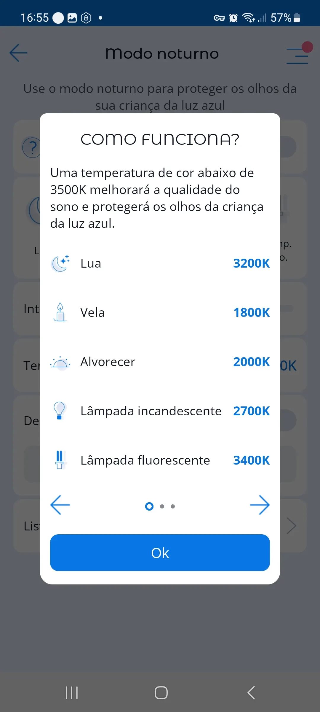 Esta opção permite proteger os seus olhos dos efeitos negativos do espectro de luz azul da tela do dispositivo durante a noite. Oftalmologistas recomendam reduzir o brilho da tela durante as horas escuras, tornando a luz mais suave e confortável para os olhos.