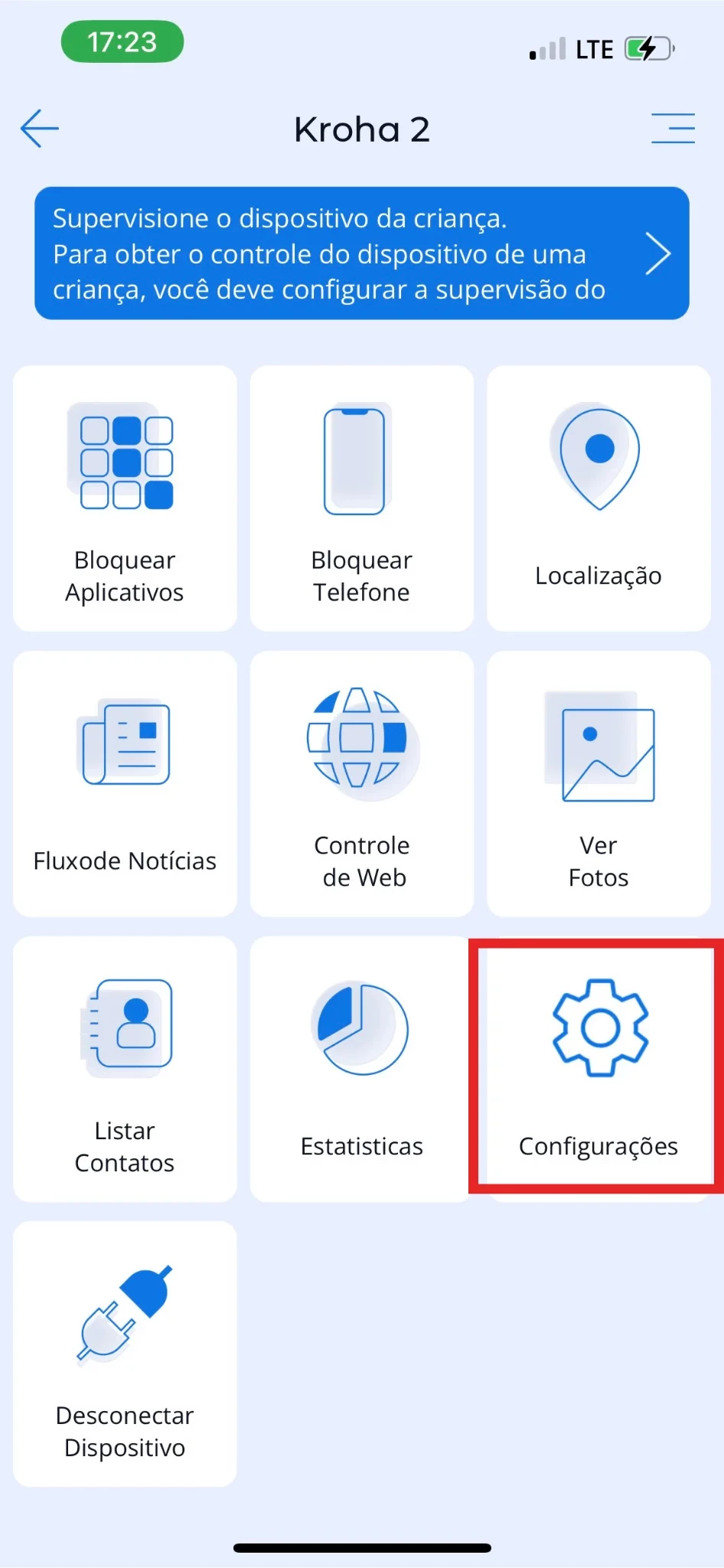 Em "Configurações", os pais têm a opção de ativar a aplicação de controlo parental Kroha e bloquear conteúdo adulto no dispositivo.
