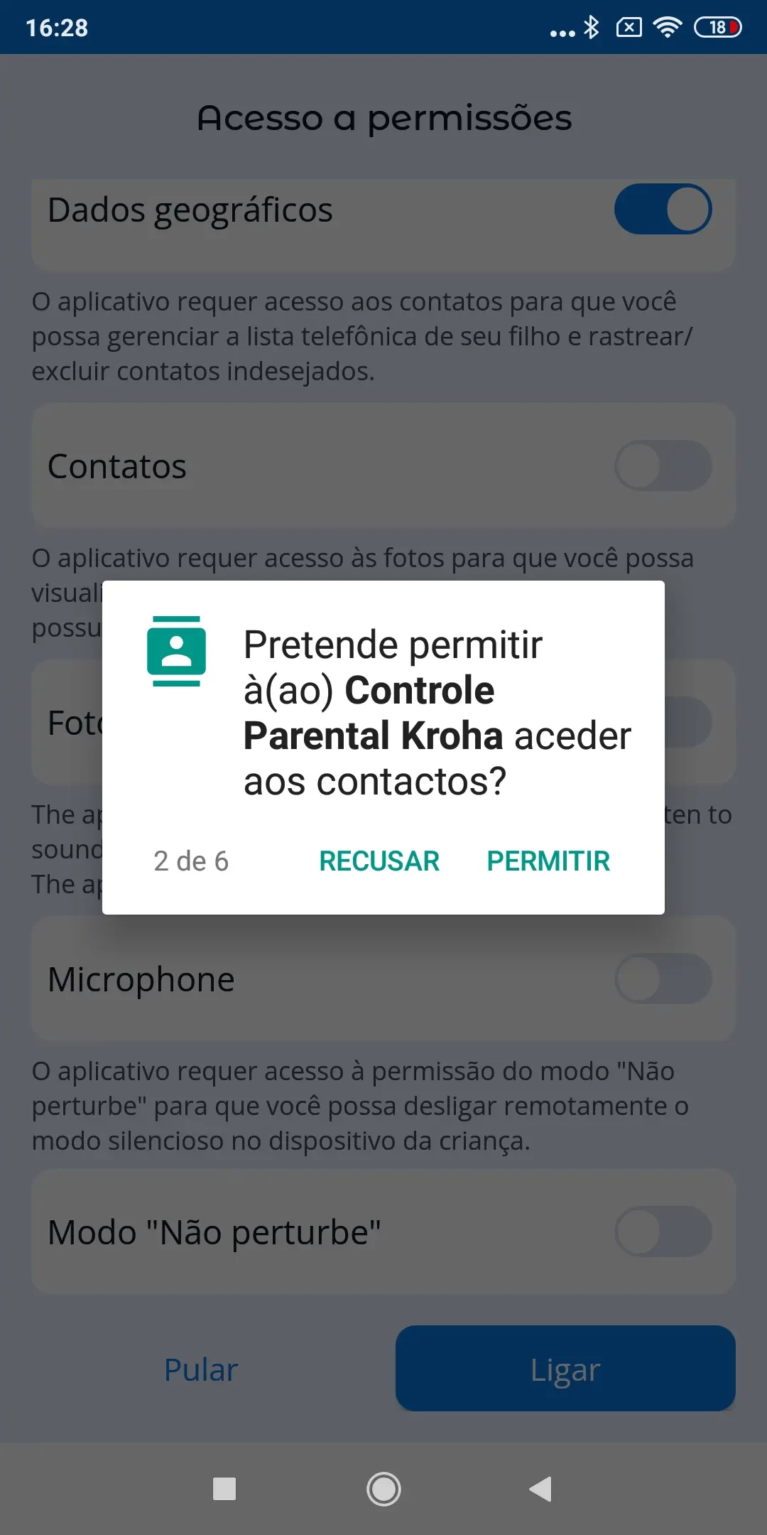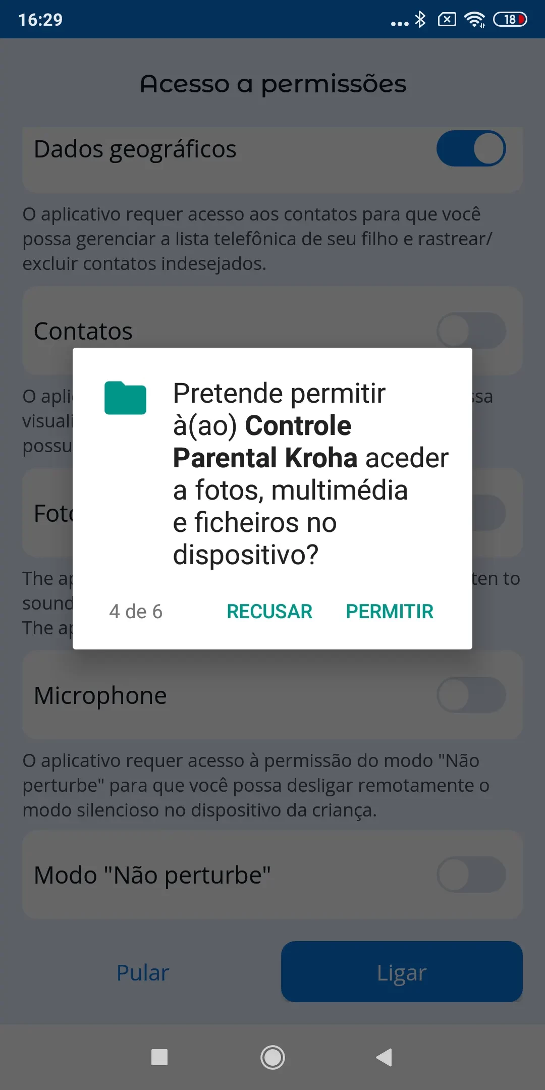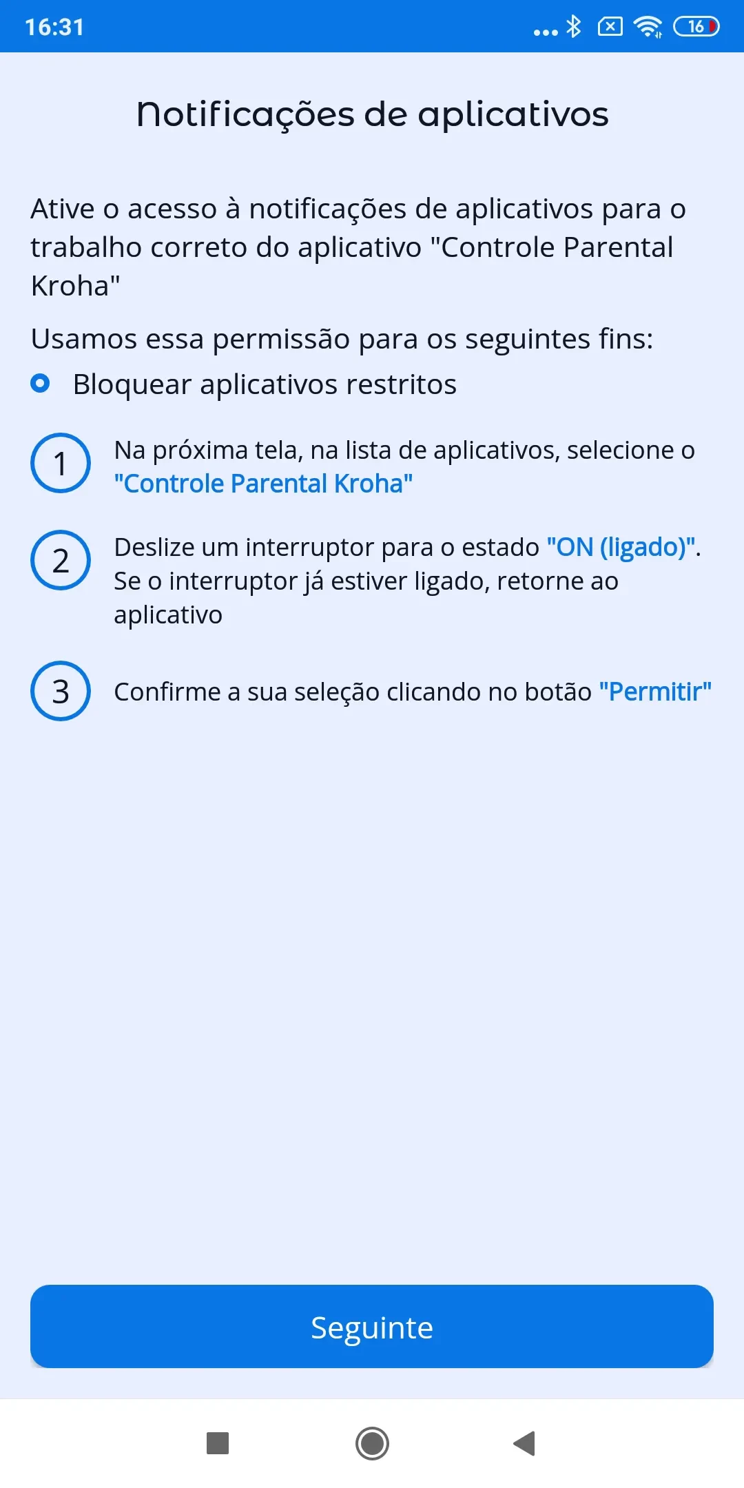 “Otimização de Bateria”: para o correto funcionamento do app de controlo parental Kroha, você precisa desativar a otimização de bateria para o app, leia o guia passo a passo para mais detalhes e toque em “Próximo”;