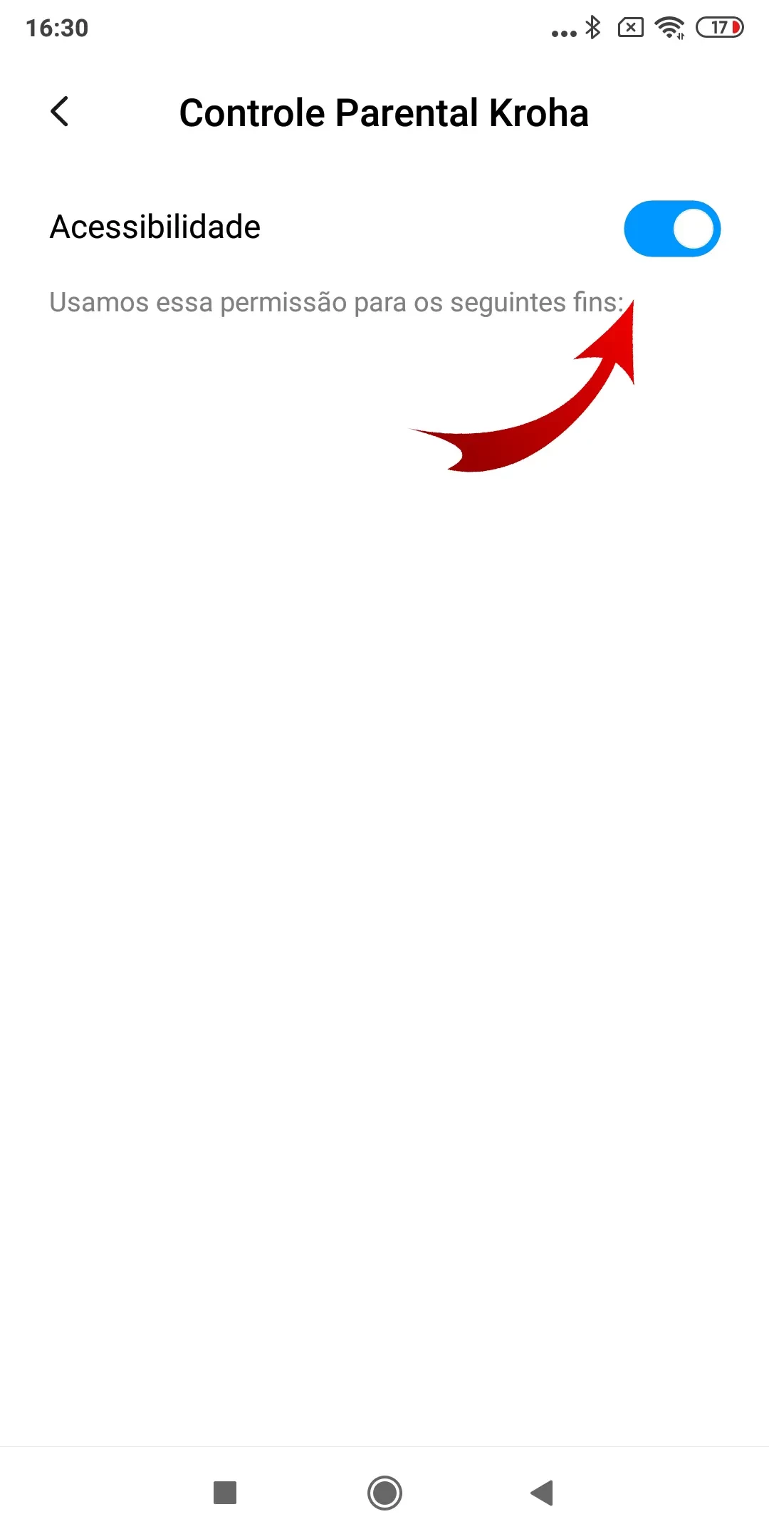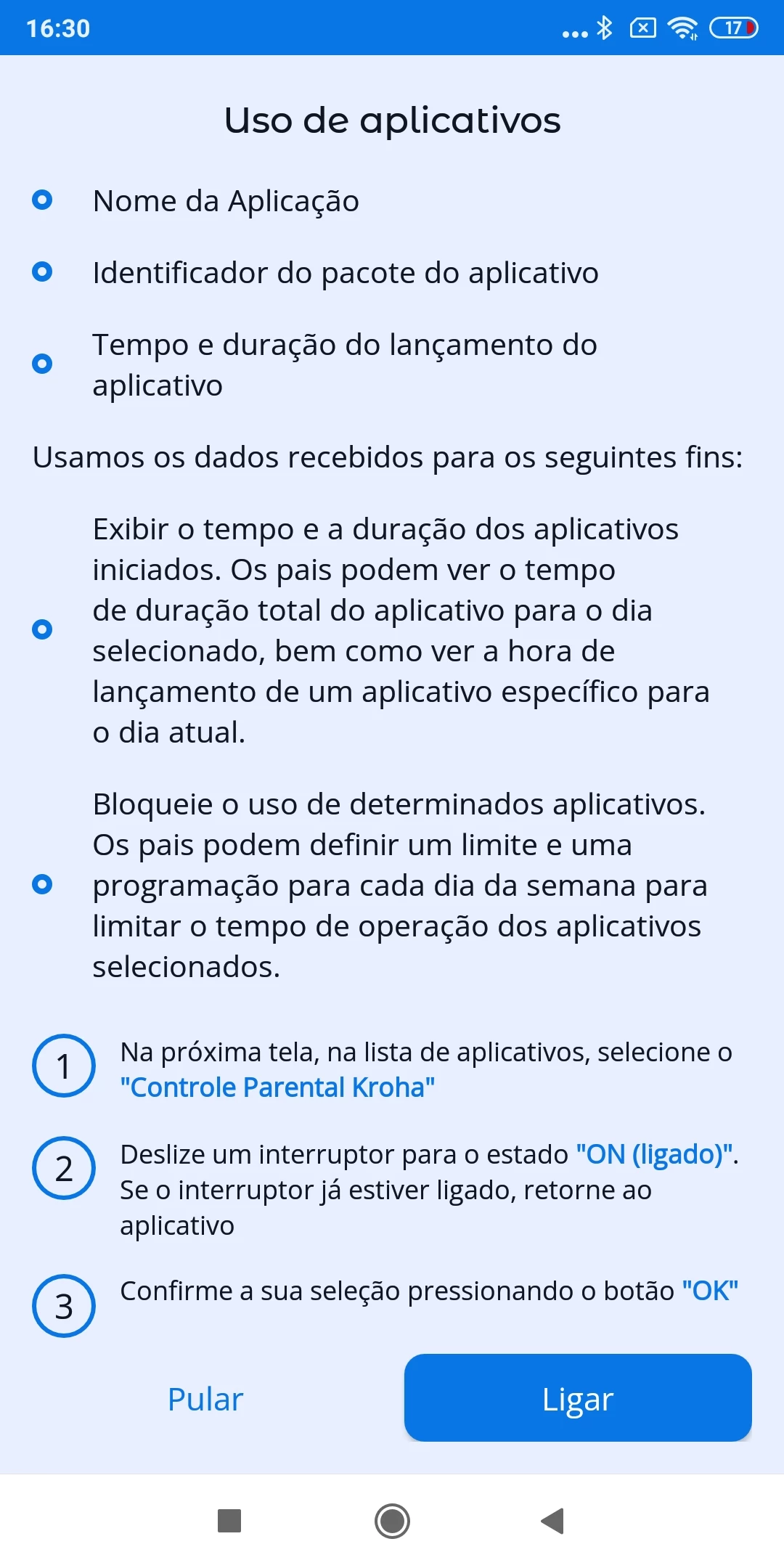 “Uso de Aplicativos”: habilite o acesso aos dados de uso de aplicativos, para que o app de controlo parental Kroha funcione corretamente, leia o guia passo a passo para mais detalhes e toque em “Próximo”;