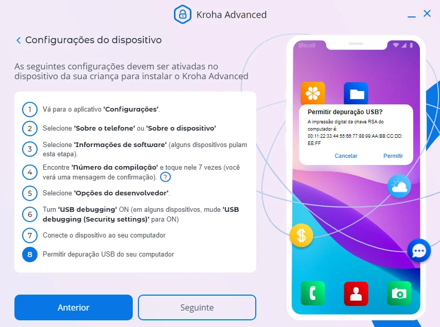 - A notificação "Permitir Depuração USB" não aparece no dispositivo da criança e o botão "Próximo" não está ativo.