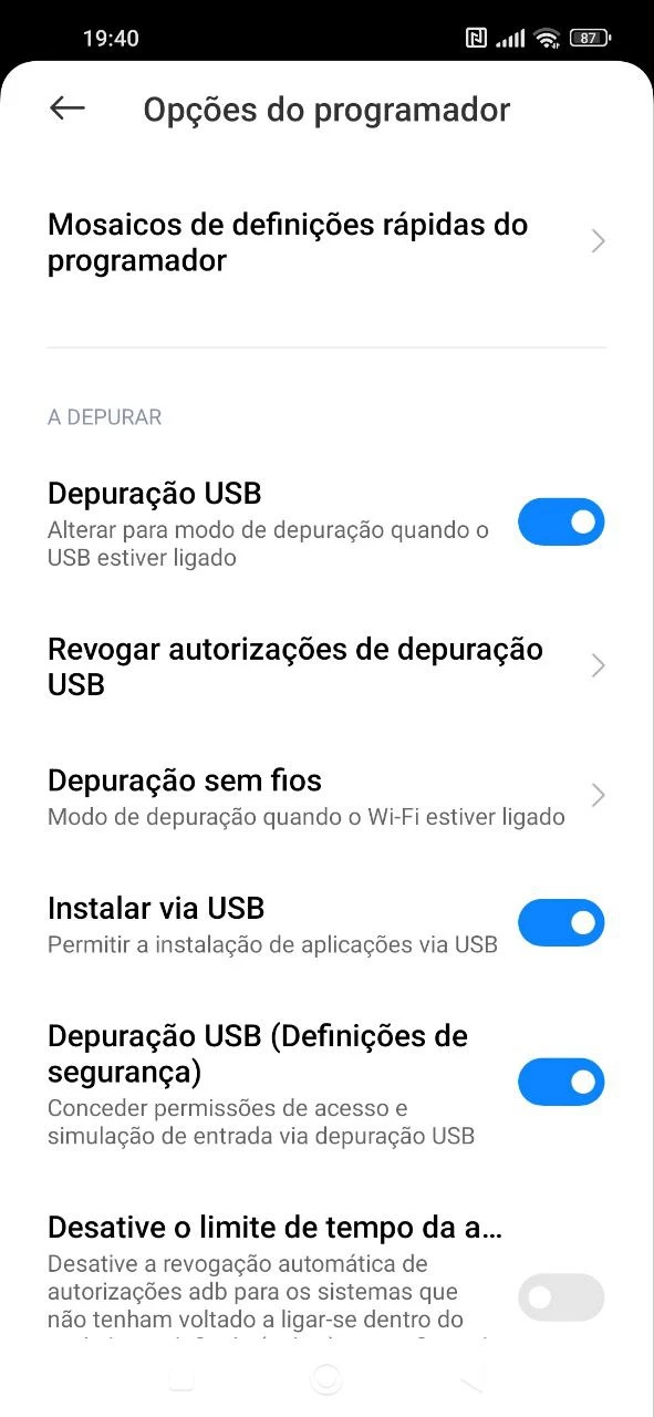 2. No dispositivo da criança, nas configurações de desenvolvedor, desligue a opção ao lado de "Depuração por USB" e, em seguida, ligue-a novamente.