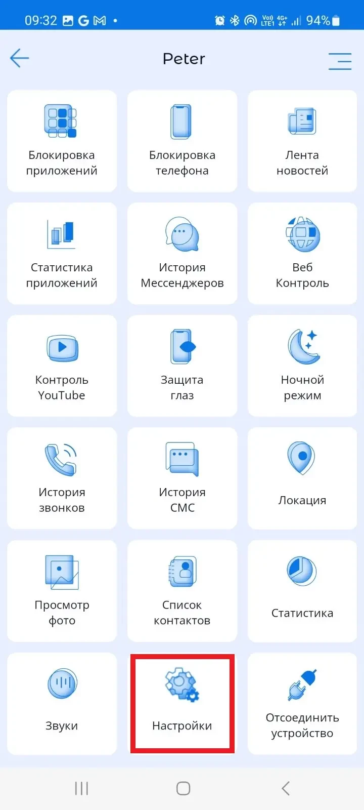 Кнопка «Настройки» в основном меню - возможность менять настройки с родительского устройства на выбранном детском устройстве.