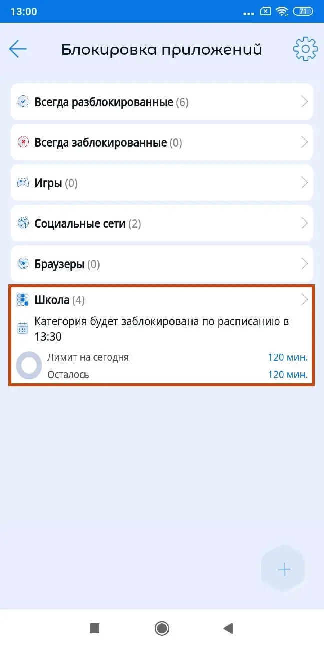 Рядом с каждой категорией указано сколько приложений в ней находится. Если на категорию установлены ограничения, то на ней отображается информация о расписании и сколько времени осталось играть ребенку, согласно установленным лимитам.