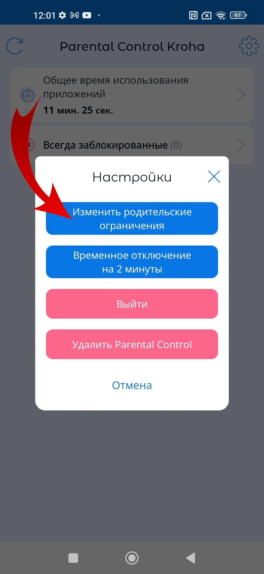 Сначала, на устройстве ребёнка откройте приложение Parental Control Kroha > Нажмите иконку шестеренки > нажмите кнопку "Изменить родительские ограничения" > введите ПИН код > Если появится какое-либо руководство по настройке, пройдите его.