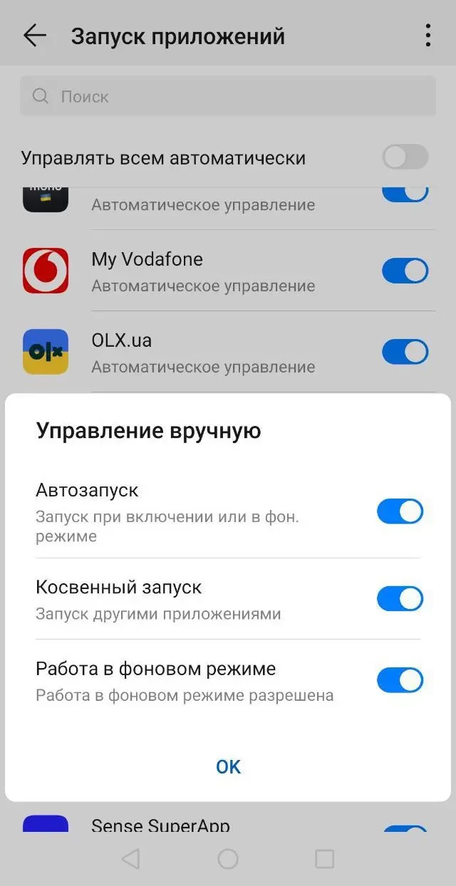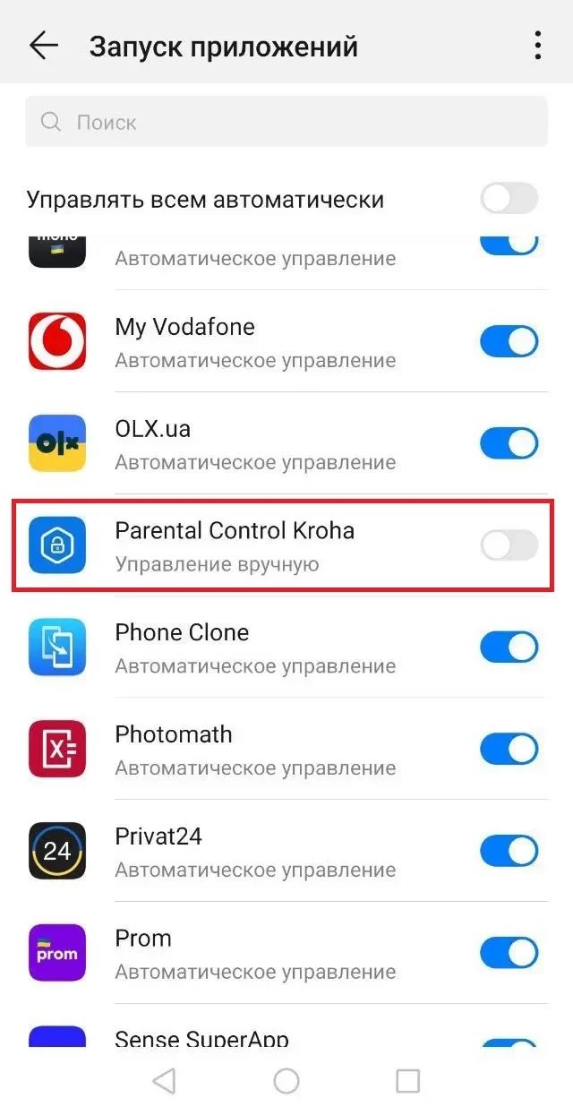 - Откройте приложение "Настройки" телефона > откройте раздел "Батарея" > откройте раздел "Запуск" > найдите приложение Parental Control Kroha > выключите переключатель напротив названия приложения Parental Control Kroha > появится окно "Ручное управление". В этом окне, все переключатели должны быть включены: "Автозапуск", "Косвенный запуск", "Работа в фоновом режиме".