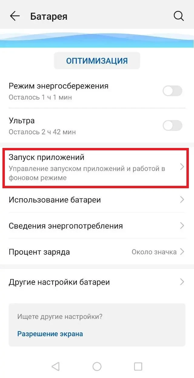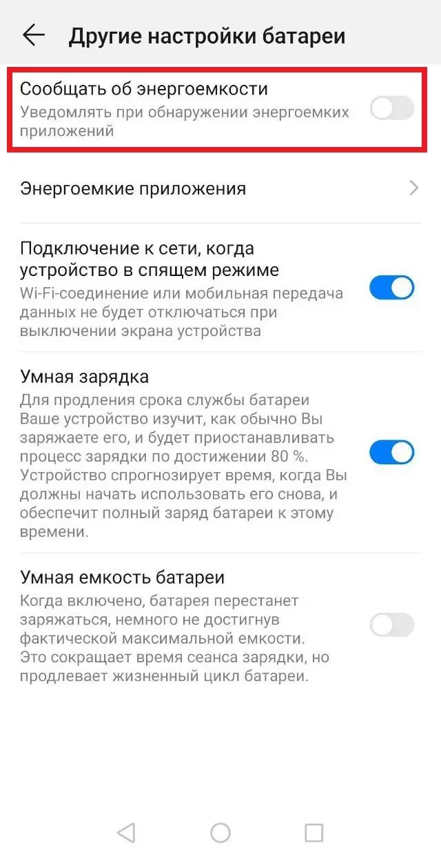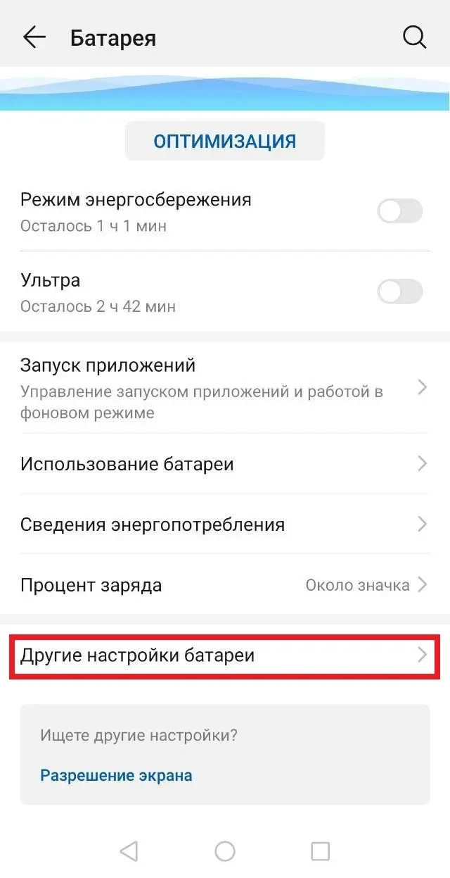 - Вернитесь в раздел "Батарея" > откройте раздел "Другие настройки батареи"(на других прошивках в правом верхнем углу нажмите на иконку настроек) > отключите уведомление об обнаружении энергоемких приложений.