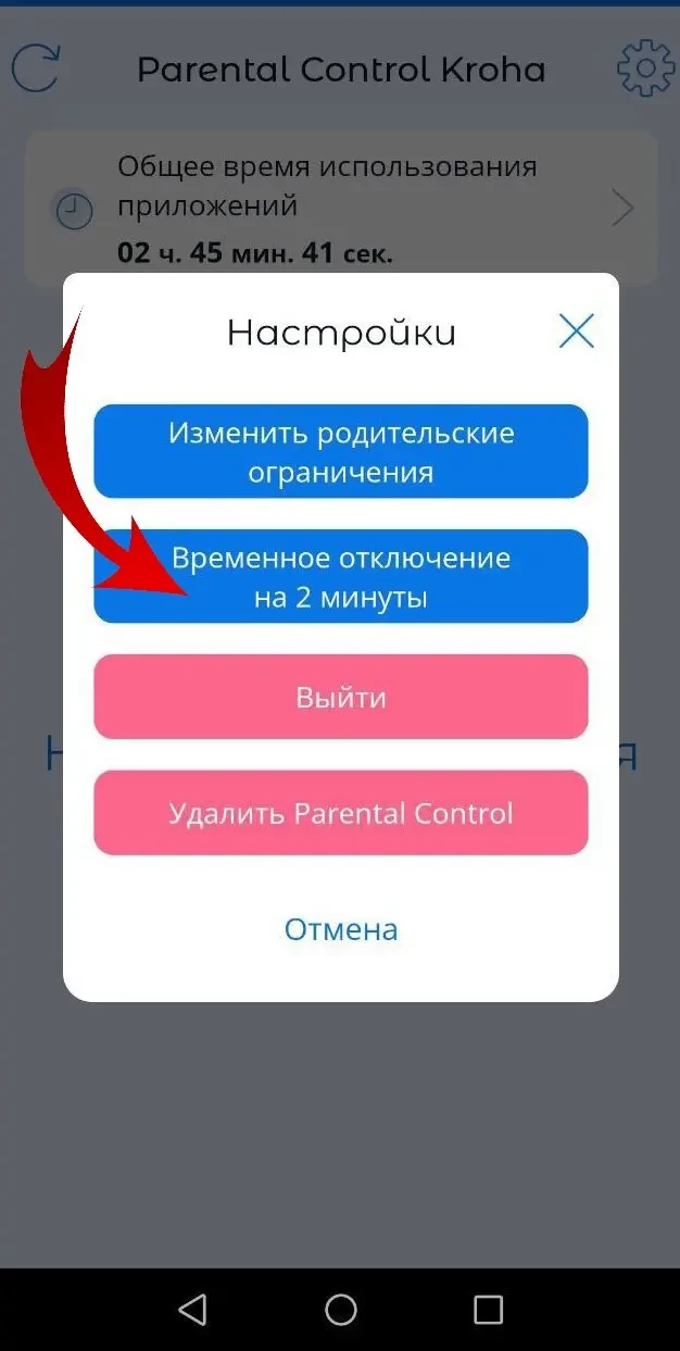 Затем откройте приложение Parental Control Kroha на устройстве ребенка > Нажмите иконку шестеренки > нажмите кнопку "Выключить на 2 минуты" > введите ПИН код. Это необходимо, чтобы настройки на устройстве ребенка не блокировались 2 минуты и вы могли проверить их.