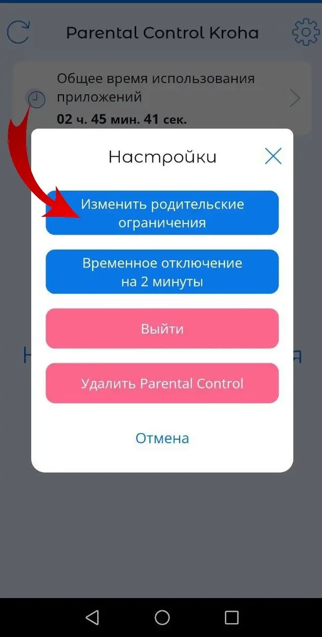 Сначала, на устройстве ребёнка откройте приложение Parental Control Kroha > Нажмите иконку шестеренки > нажмите кнопку "Изменить родительские ограничения" > введите ПИН код > Если появится какое-либо руководство по настройке, пройдите его.