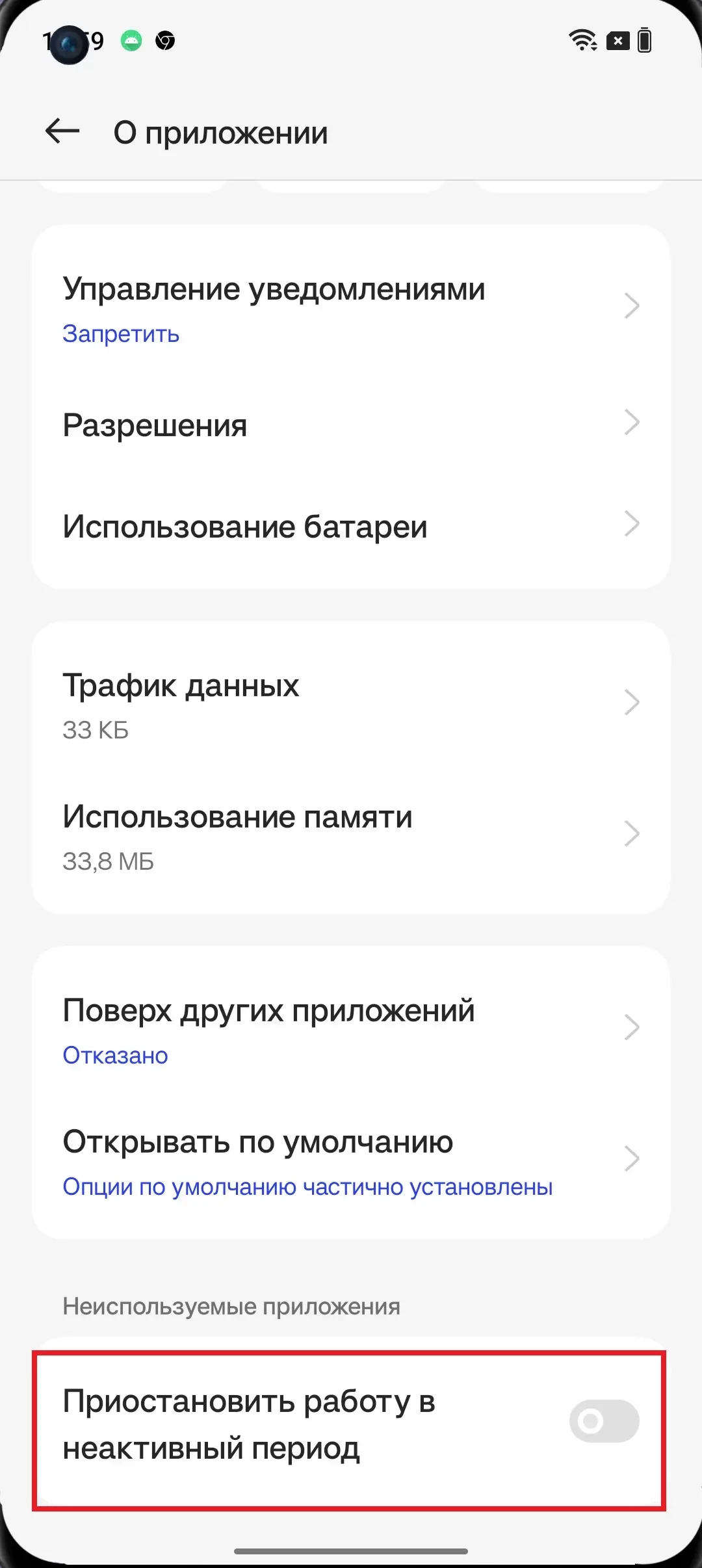 - Откройте "Настройки" на устройстве ребенка > раздел "Приложения" > Управление приложениями > Parental Control Kroha > Приостановить работу в неактивный период > Выключить.