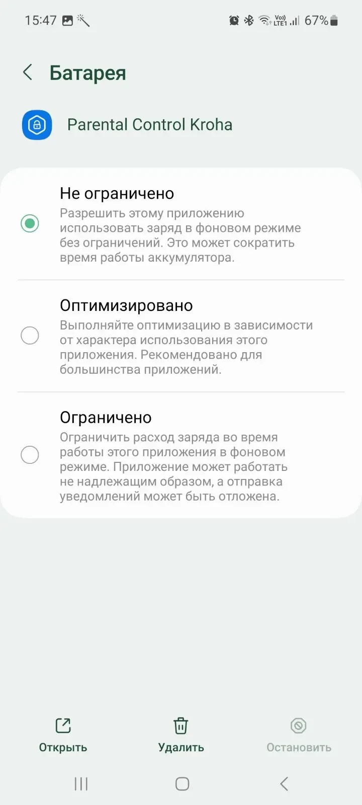 - Откройте “Настройки” на устройстве ребенка > Приложения > Parental Control Kroha > Аккумулятор (Батарея) > Не оптимизировать.